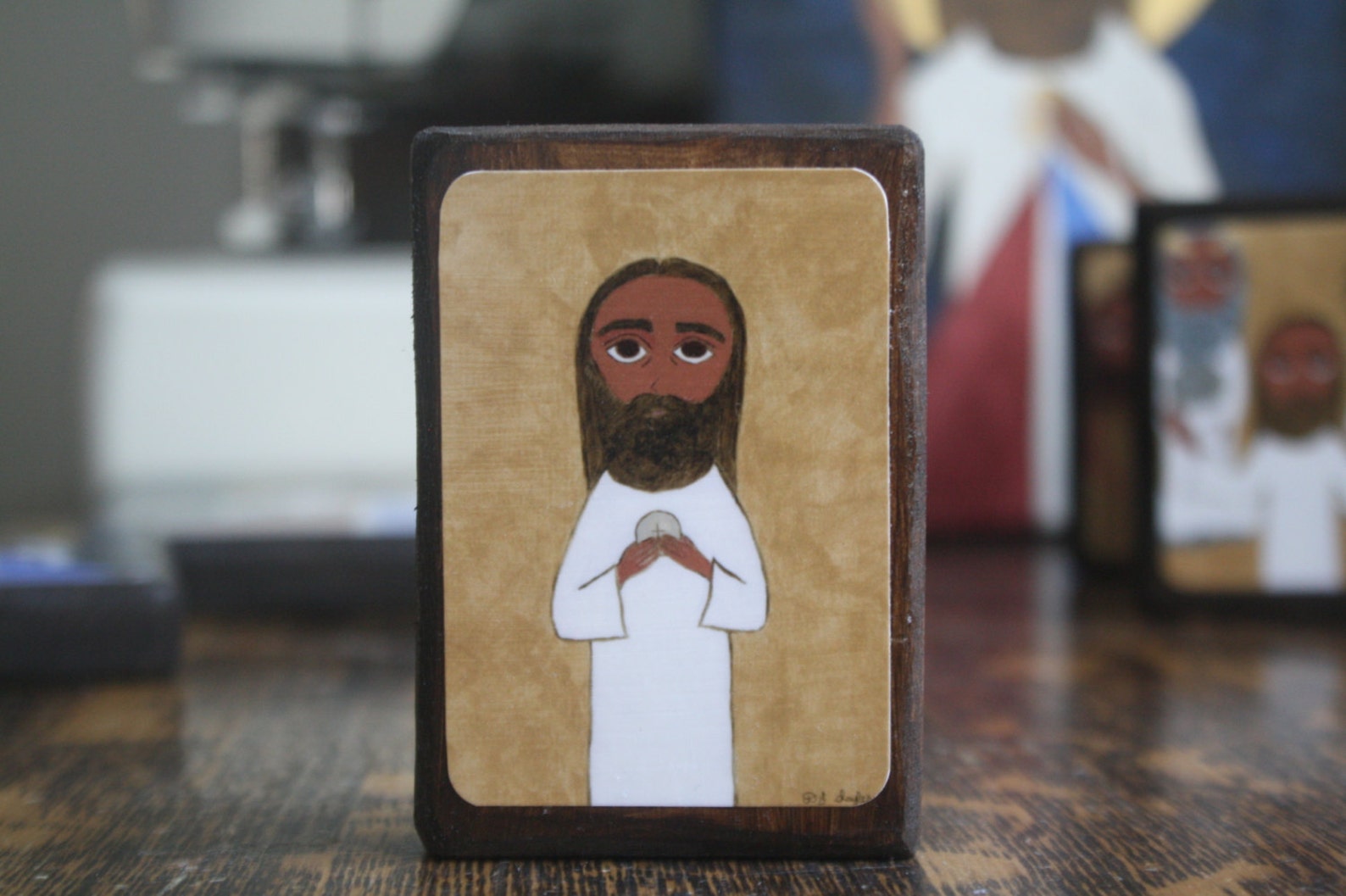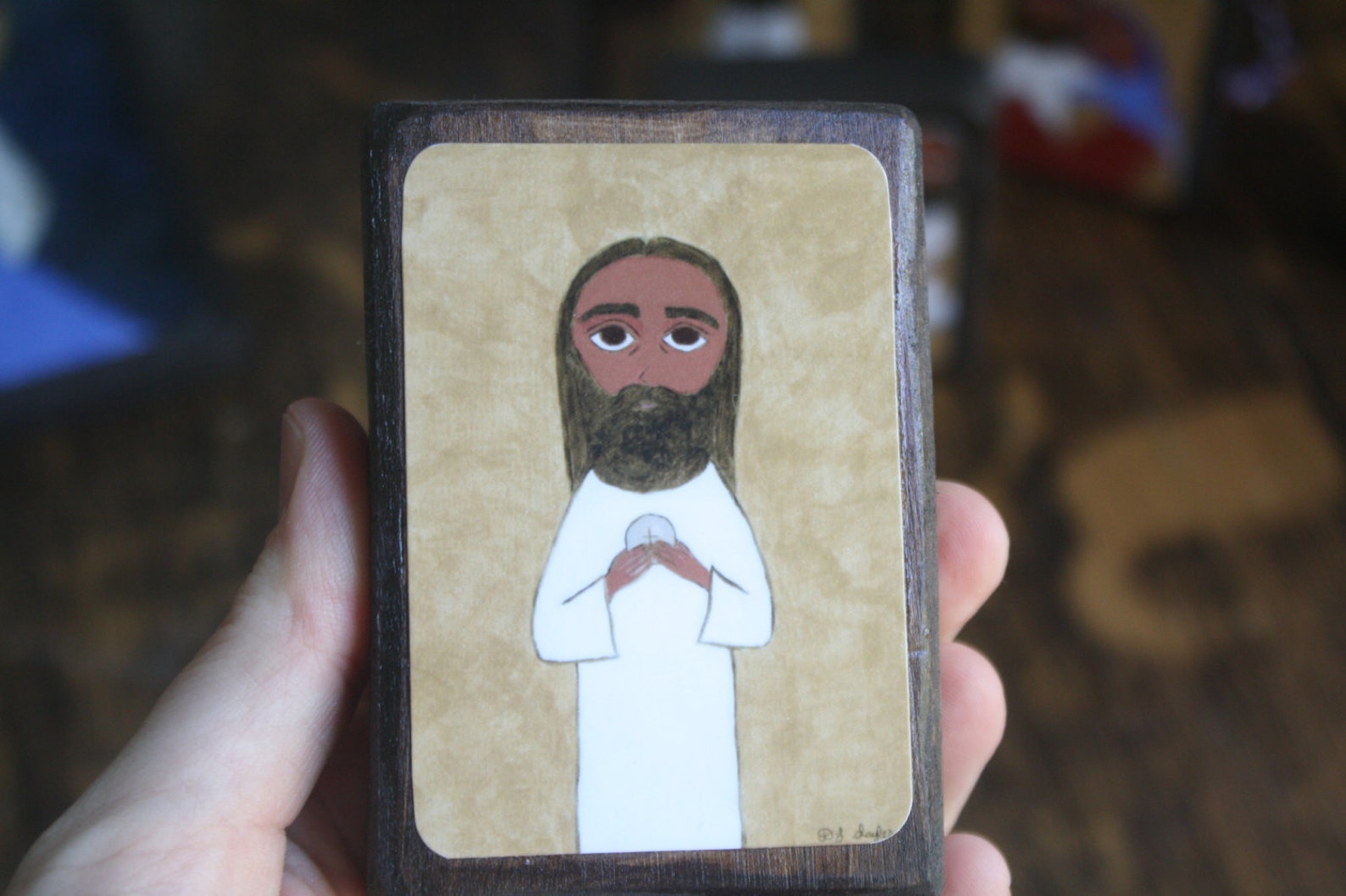 Be the first to review “2.5 ish X 3.5 ish inch the institution of the Eucharist byzantine/folk icon on wood” Cancel reply