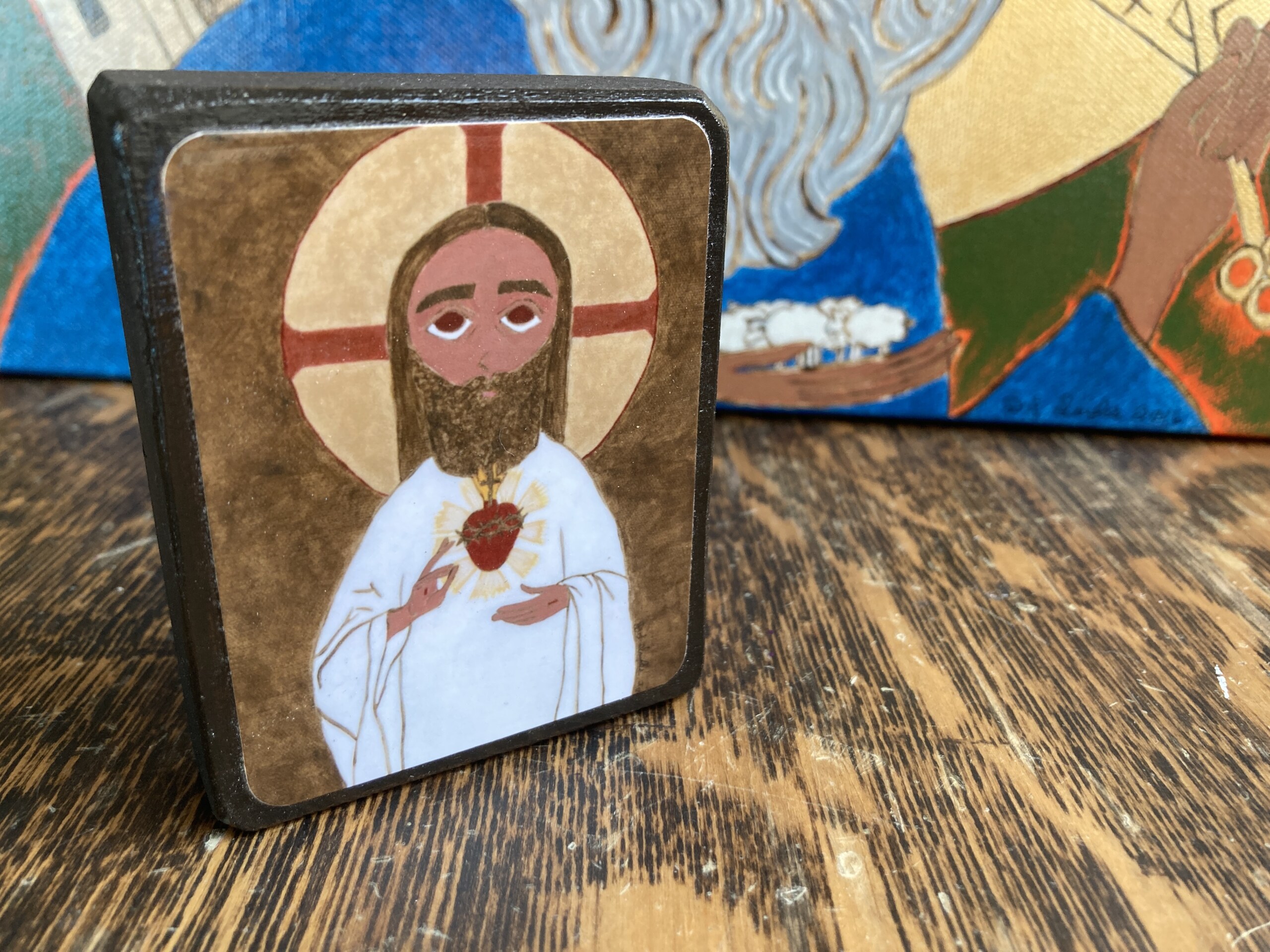 2.5 X 3.5 ish Folk/Byzantine style Icon Print on Wood Jesus Sacred Heart