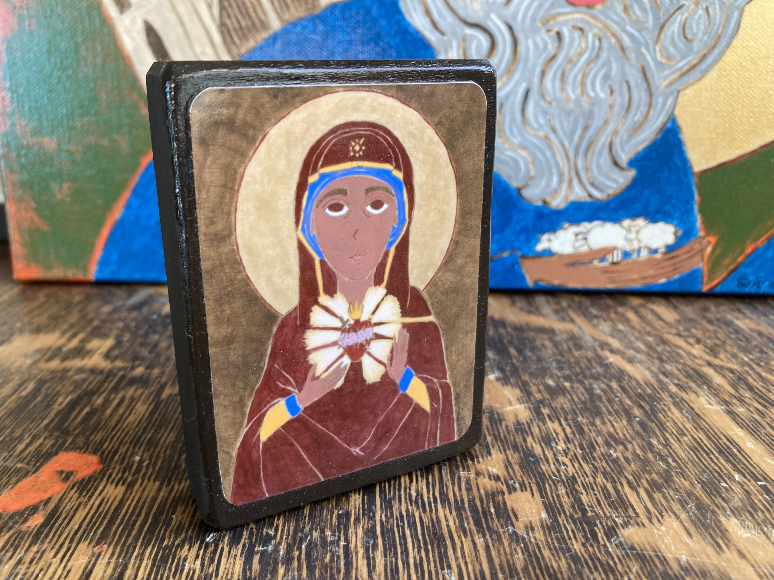 2.5 X 3.5 ish Folk/Byzantine style Icon Print on Wood Mary Immaculate Heart