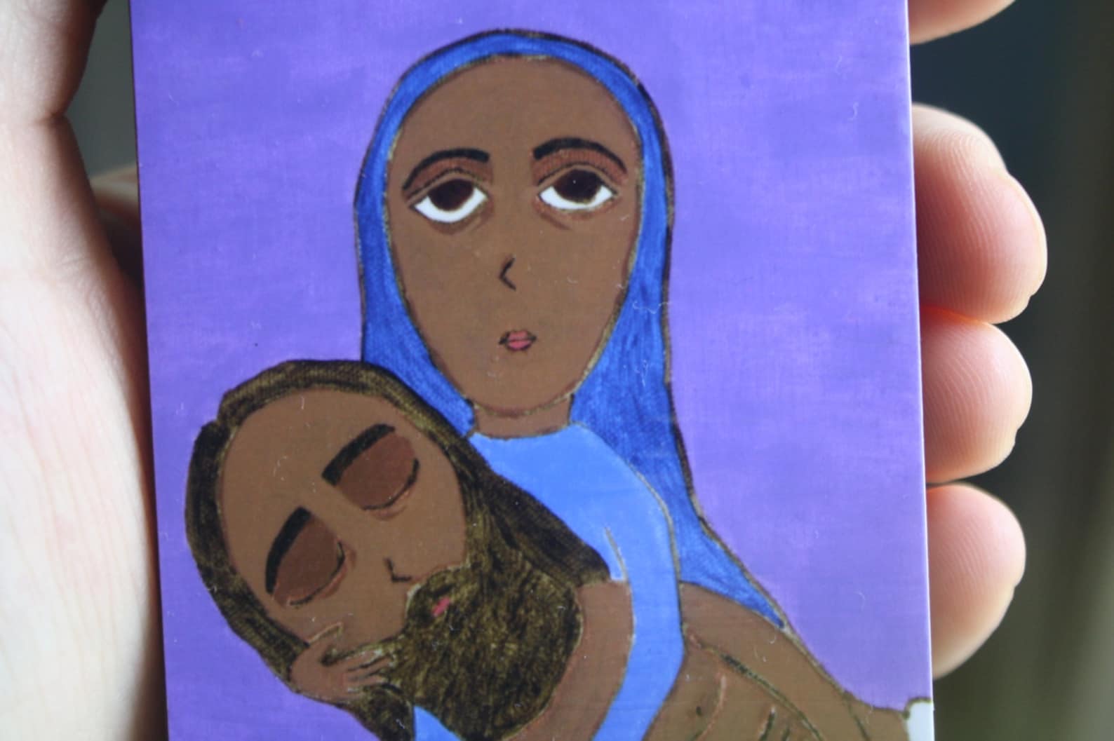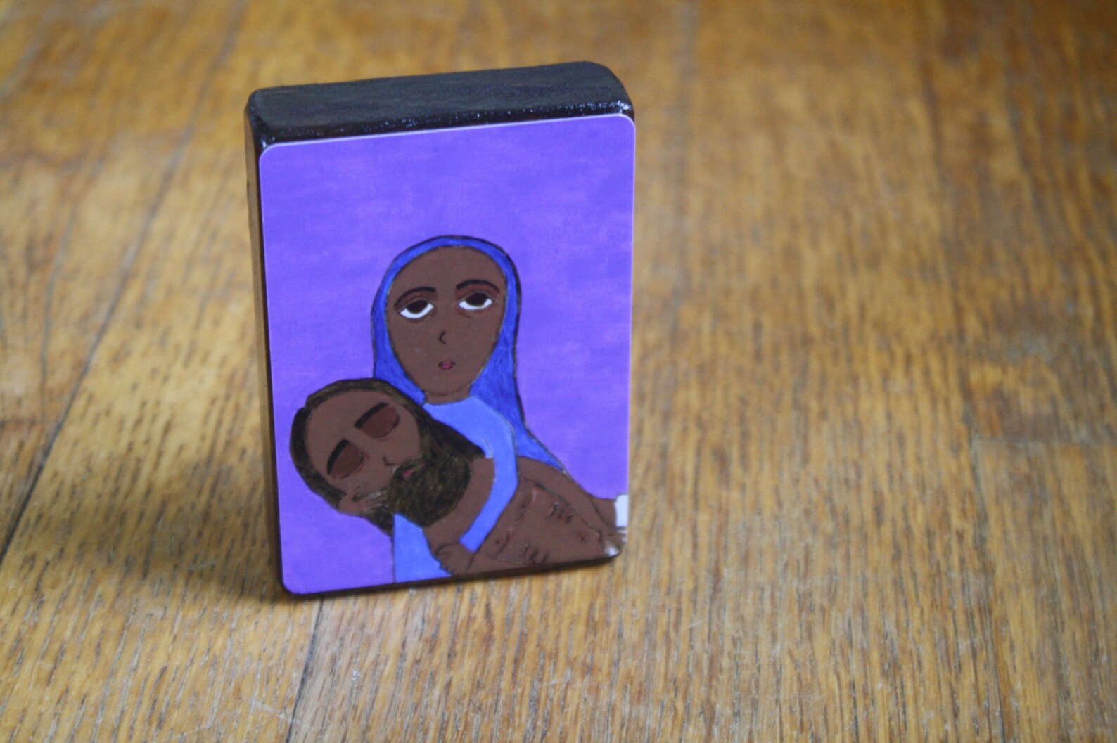 A little icon print on wood from my original painting of taking Jesus down from the Cross. The Pieta. There’s a small hanger in back. Please allow up to 1 week for artisaning.