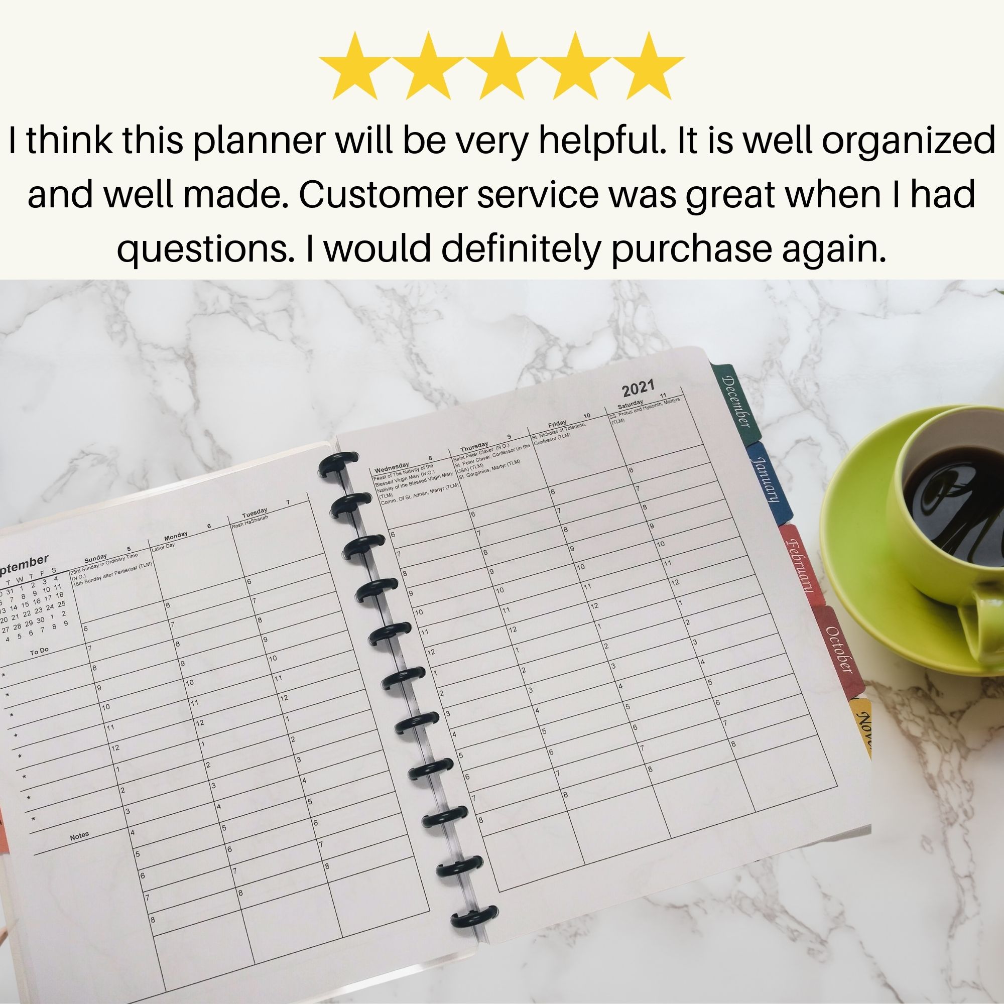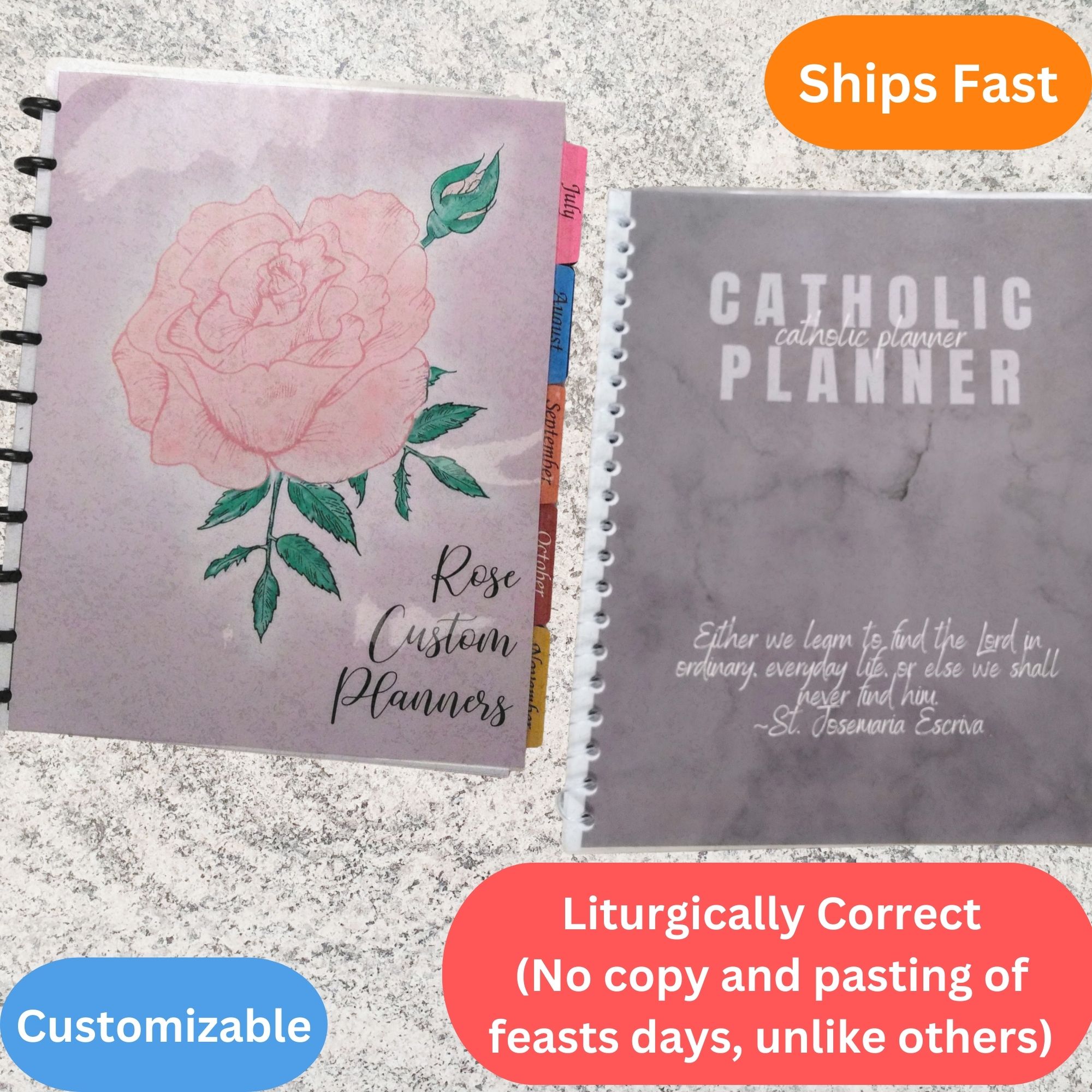 The full-size planner is 8.5” x 11” in size. All planners are printed on 28lb premium paper and come with seven pages of prayers, a perpetual calendar, habit trackers at the start of the month, a journal page at the end of each month, and more. Every planner has both the Traditional Latin Mass (TLM) and Current (NO, Novus Ordo) liturgical feast days listed on the monthly and weekly calendar pages.