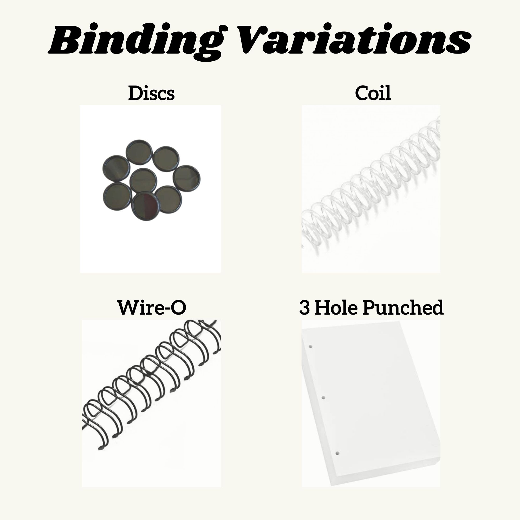 Our most popular binding is the disc-style. Discs are incredibly versatile: they open like a spiral notebook but allow pages to be moved like a 3-ring binder. Other styles are available include coil, wire binding, 3 hole punched, and unpunched.