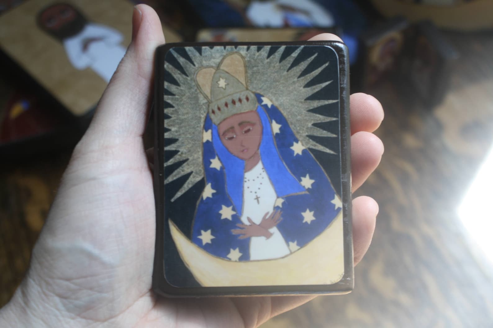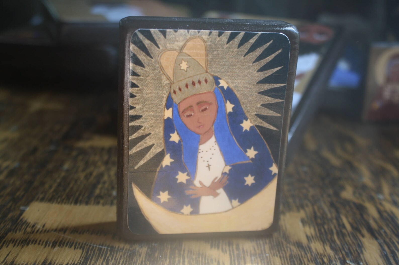 Here and there, I see a Polish folk art piece for sale made of inlaid straw (I think?) depicting Mary sitting on the moon. I love it! But each time I’ve come across it, it has gotten bought out from under me.
