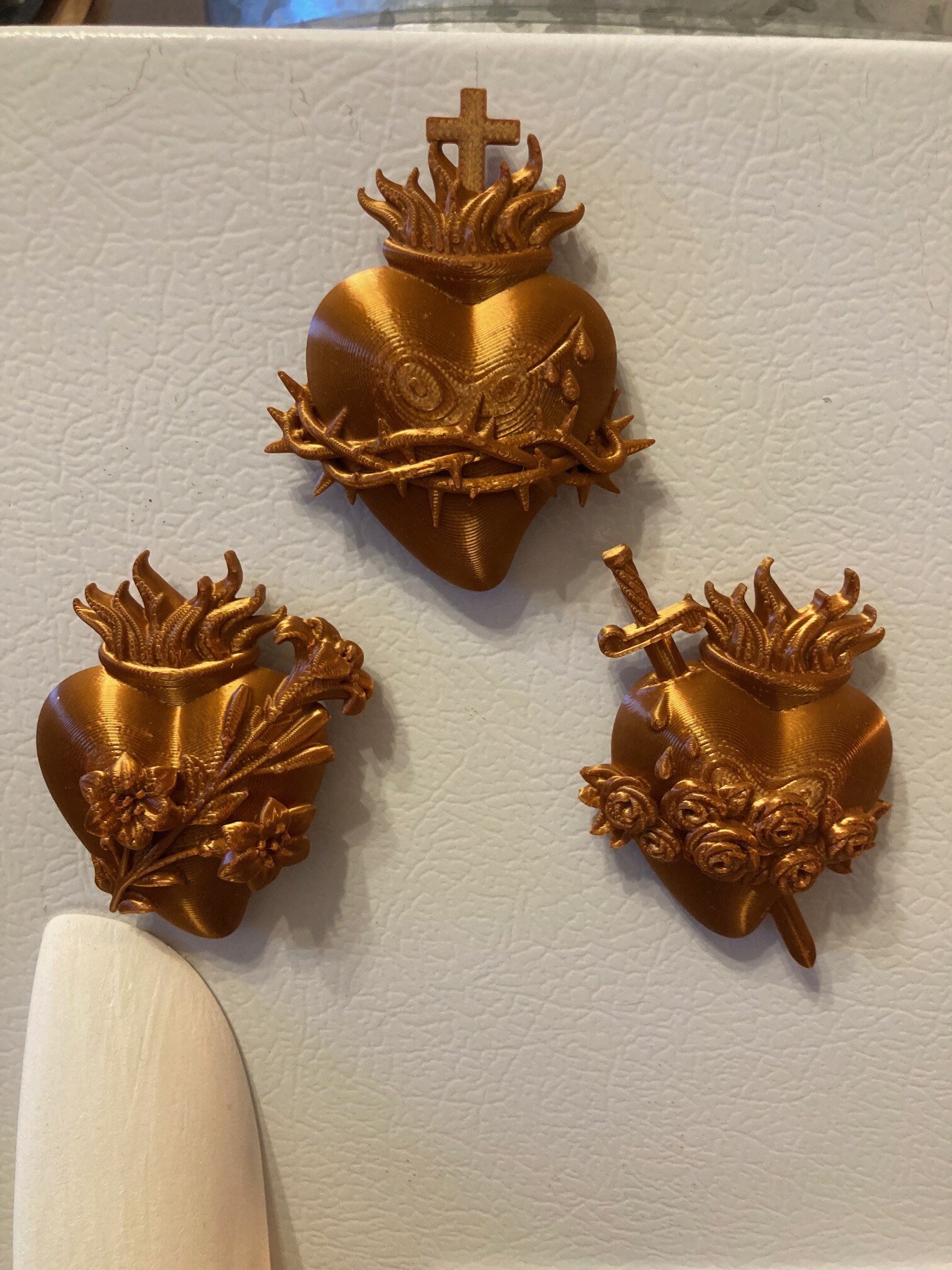 Refrigerator magnets of the Sacred Heart of Jesus, Immaculate Heart of Mary, & Most Chaste Heart of St. Joseph. Copper colored.