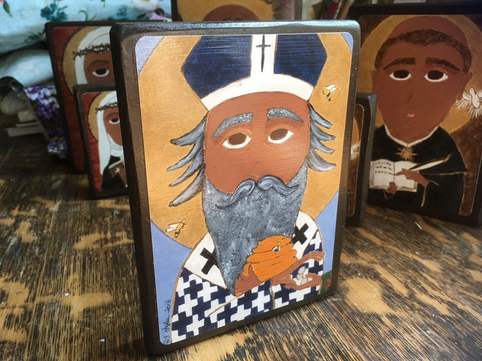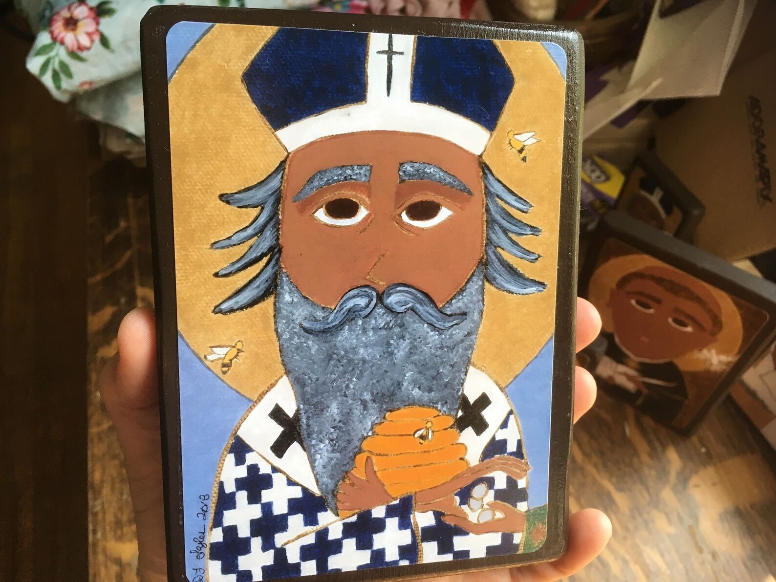 There’s a legend that when Saint Ambrose was a baby, a swarm of bees landed on his face and then left the baby uninjured, leaving behind only a drop of honey. His father said that he believed it was a sign that his son would grow up to be a great speaker (I’m sure he said this after changing his drawers because a swarm of bees had just landed on his son’s face! 😱)