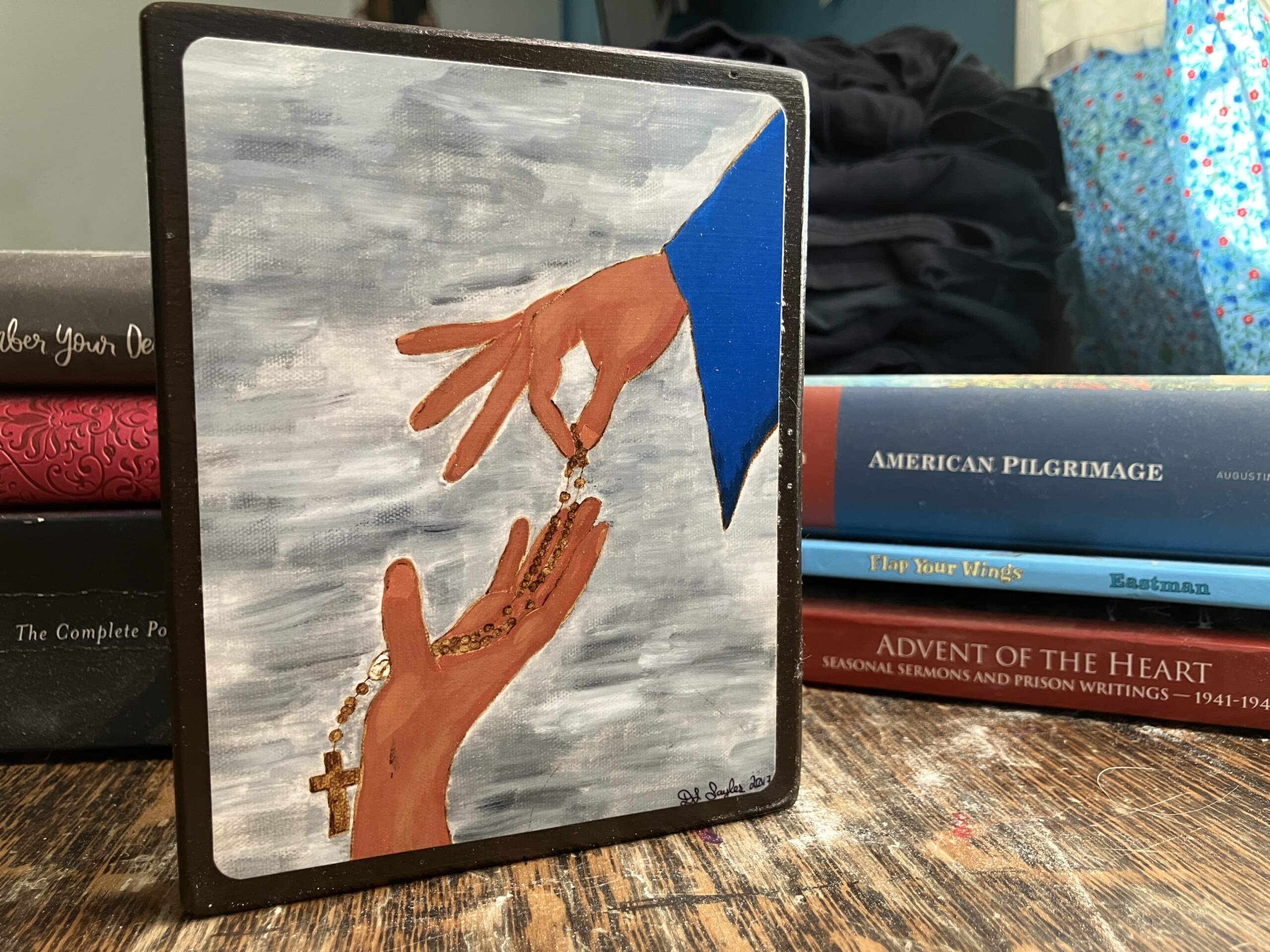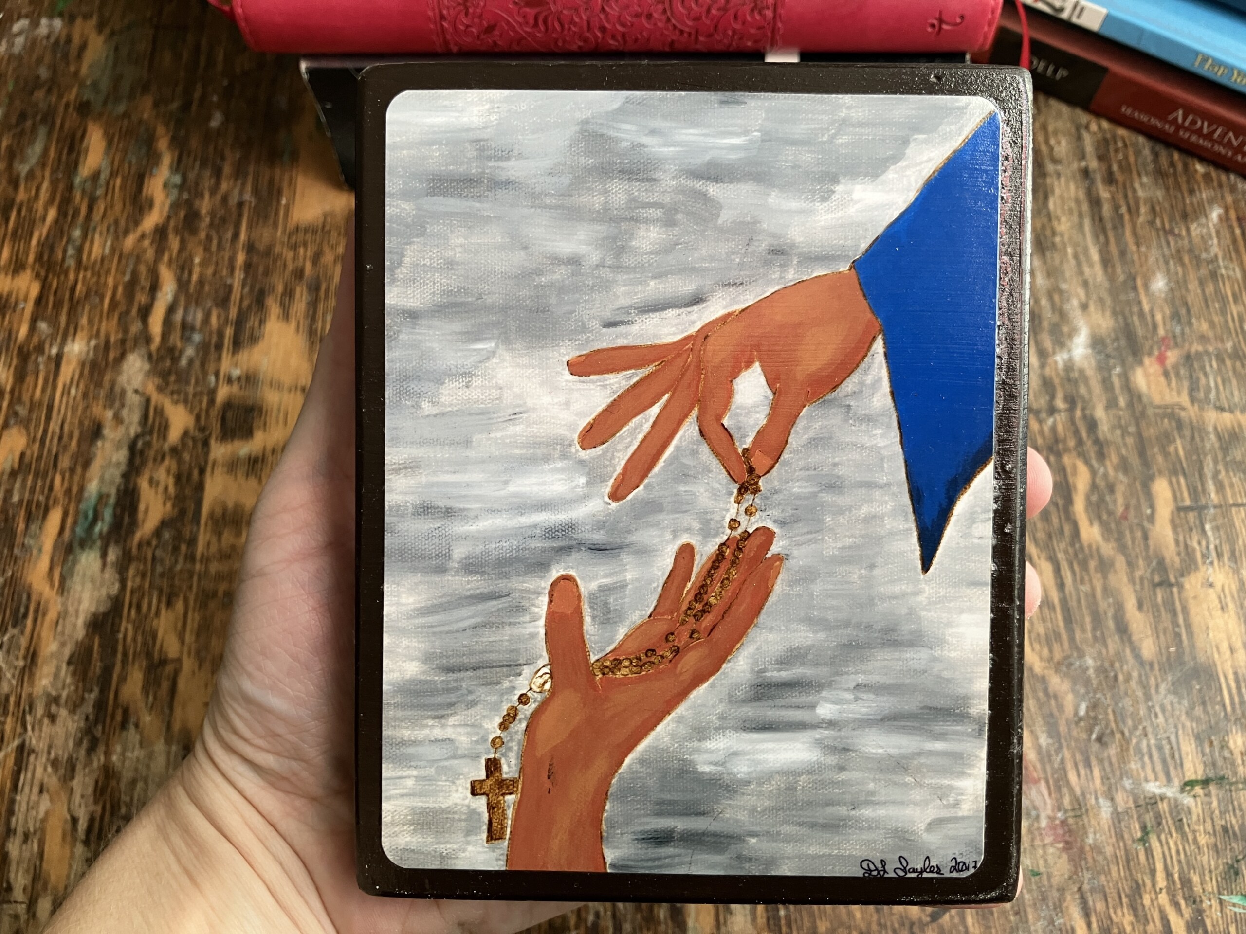 I was working on a cover for a little book on the rosary I was working on and came up with this. I ended up not using it because it was a little too serious for a humor book. But i really liked how it came out. A fitting decoration for any rosary-lovin’ Catholic (or non-Catholic too, I guess).