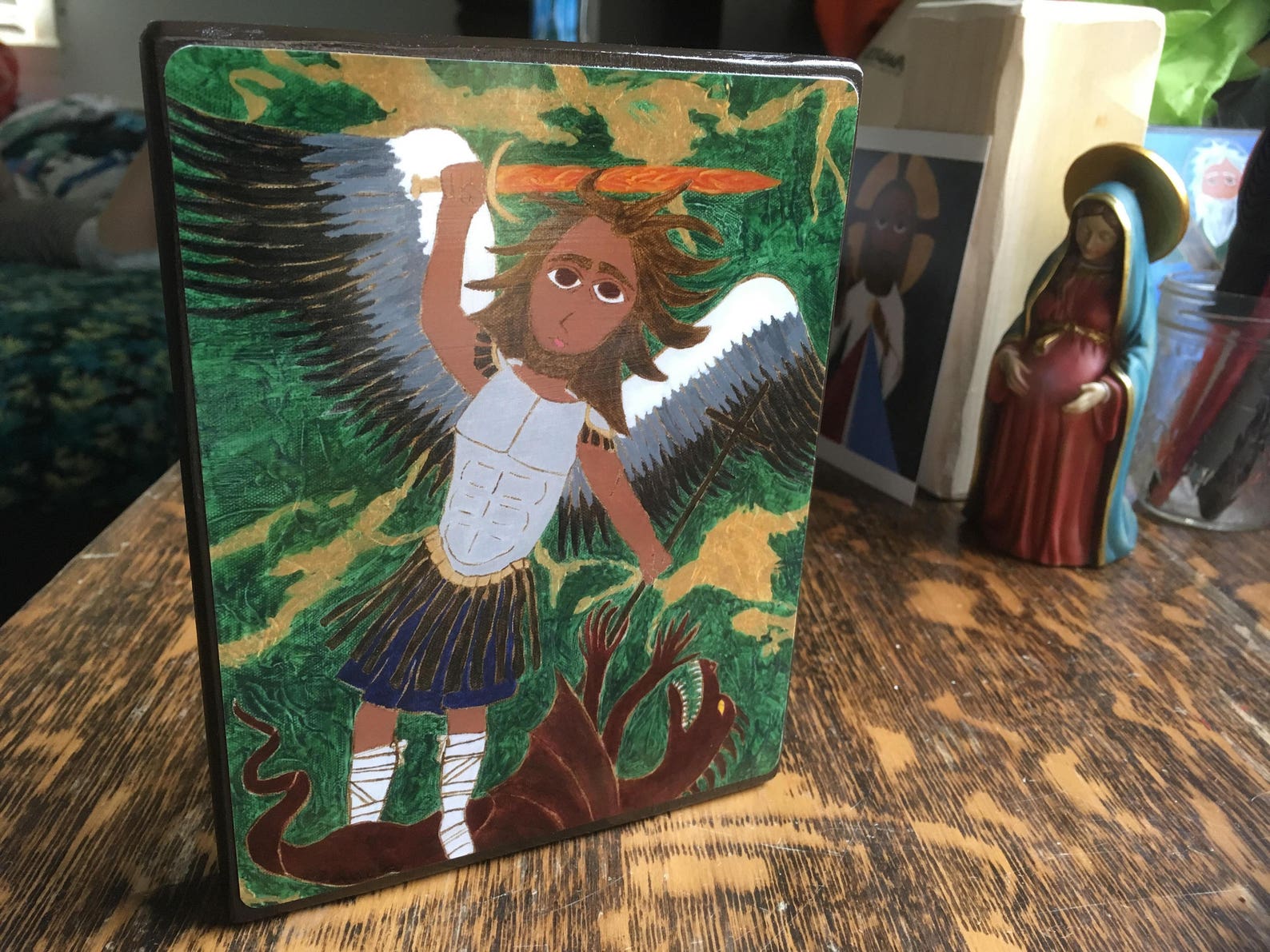 I’ve been putting off painting saint Michael because of all the pressure! He’s probably the most painted or drawn saint in the history of the world! And some of those paintings and drawings are incredible! Plus, “bad a**” isn’t really what people think when they see my paintings, but that is what is expected of Saint Michael.
