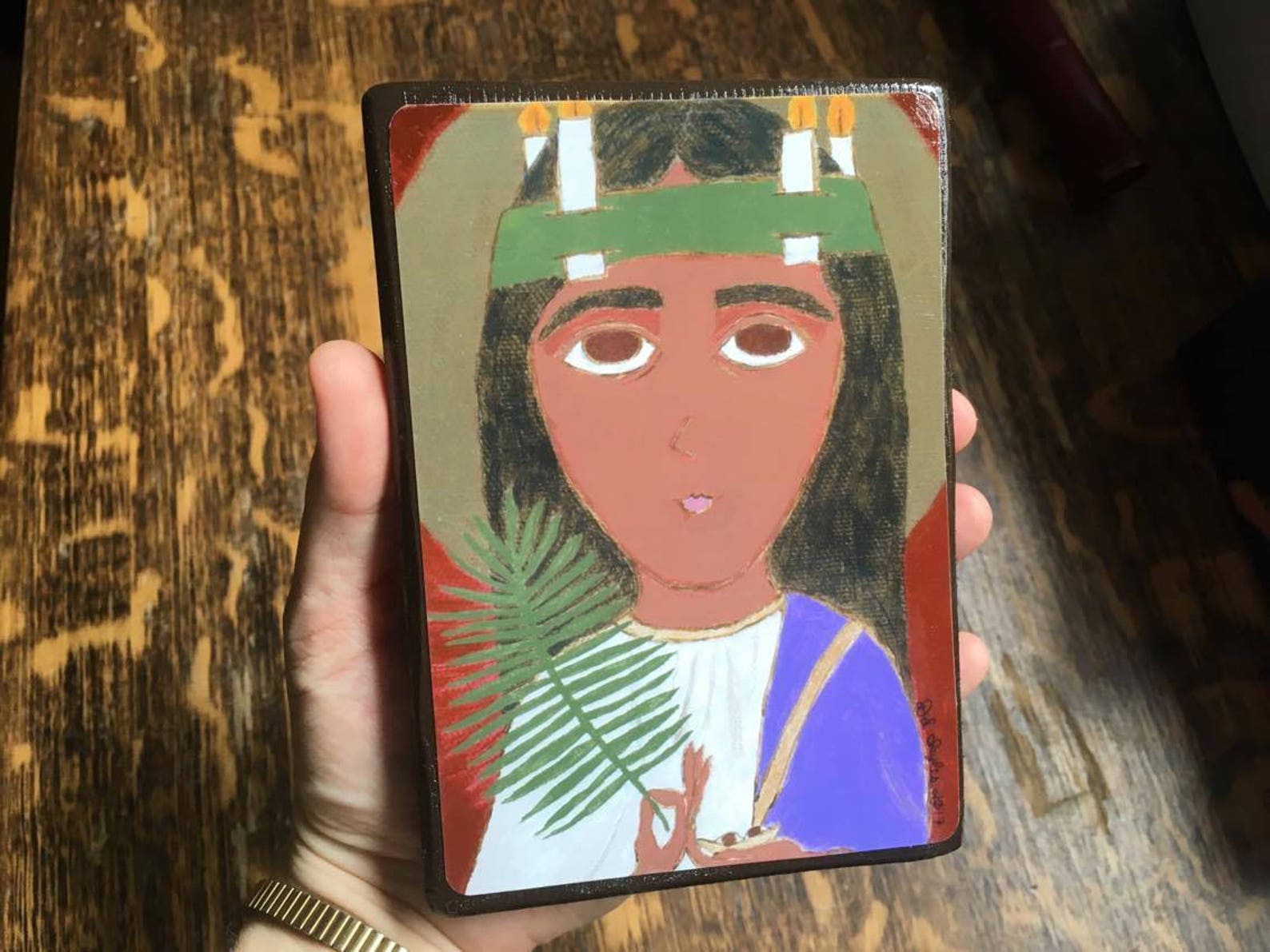 This is saint Lucy. I was surprised to find out she was Sicilian since most images I’d seen of her were blonde! Very little is actually known about her except that she was killed under Diocletian (bad, bad man!) in about 304 AD. But there is plenty of legend surrounding her including that she was very difficult to kill, was made so heavy even oxen couldn’t pull her out of her cell when her captors tried to force her into a brothel (something the Romans liked to do to the Christian women that had consecrated their virginity), she’d bring supplies to the Christians hiding in the catacombs and tied candles to her head to keep both hands free (which my daughter informed me isn’t very safe), and she had her eyes gouged out and they were miraculously retuned to their sockets upon her death (which is why she is the patron saint of eye patients).