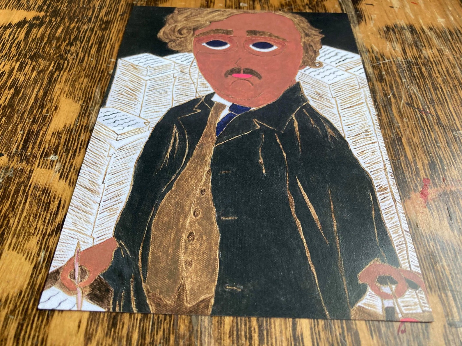 He’s writing in front of the stacks and stacks of his writings. (He was very prolific!)