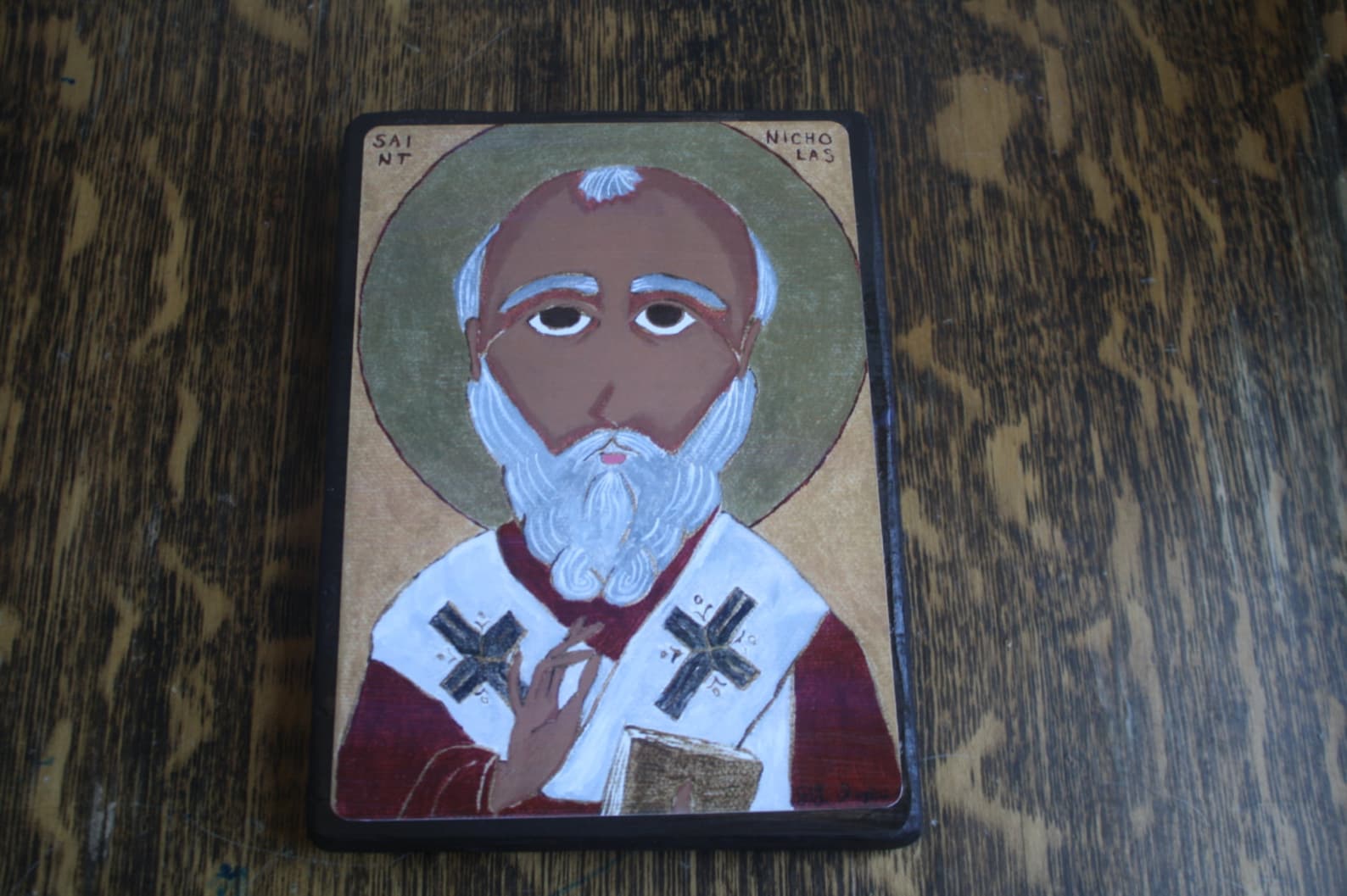 Icon print on wood with a small hanger in back. Please allow up to but not necessarily a week for artisaning.