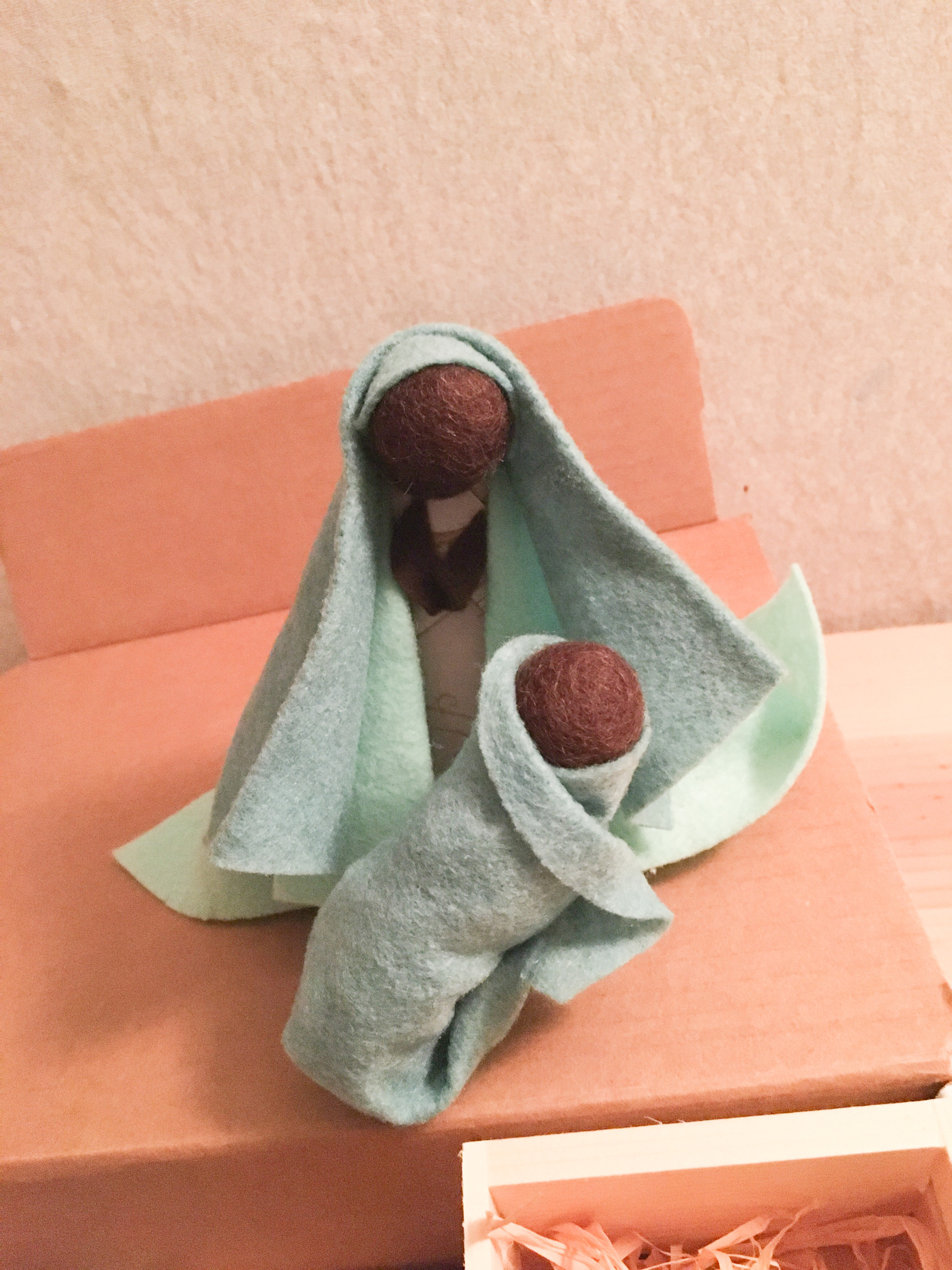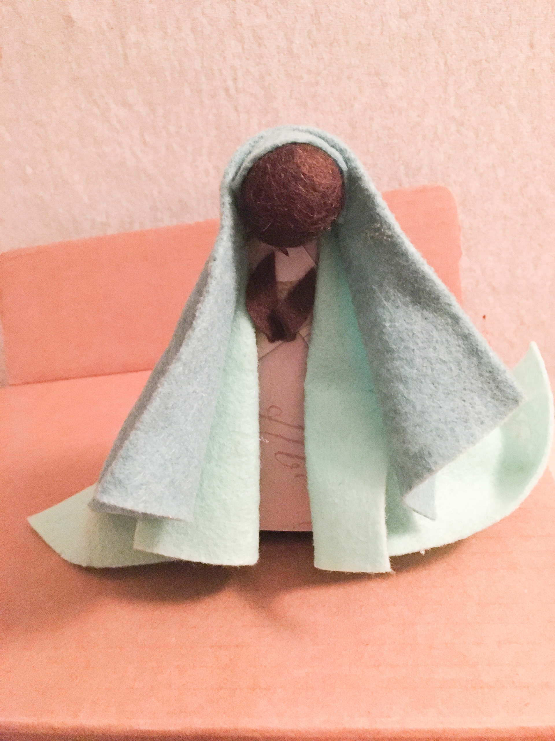 **Mother Mary felt doll (paper cone-body, wood craft stick with wool ball- head, large felt square- dress, small felt square-mantle)