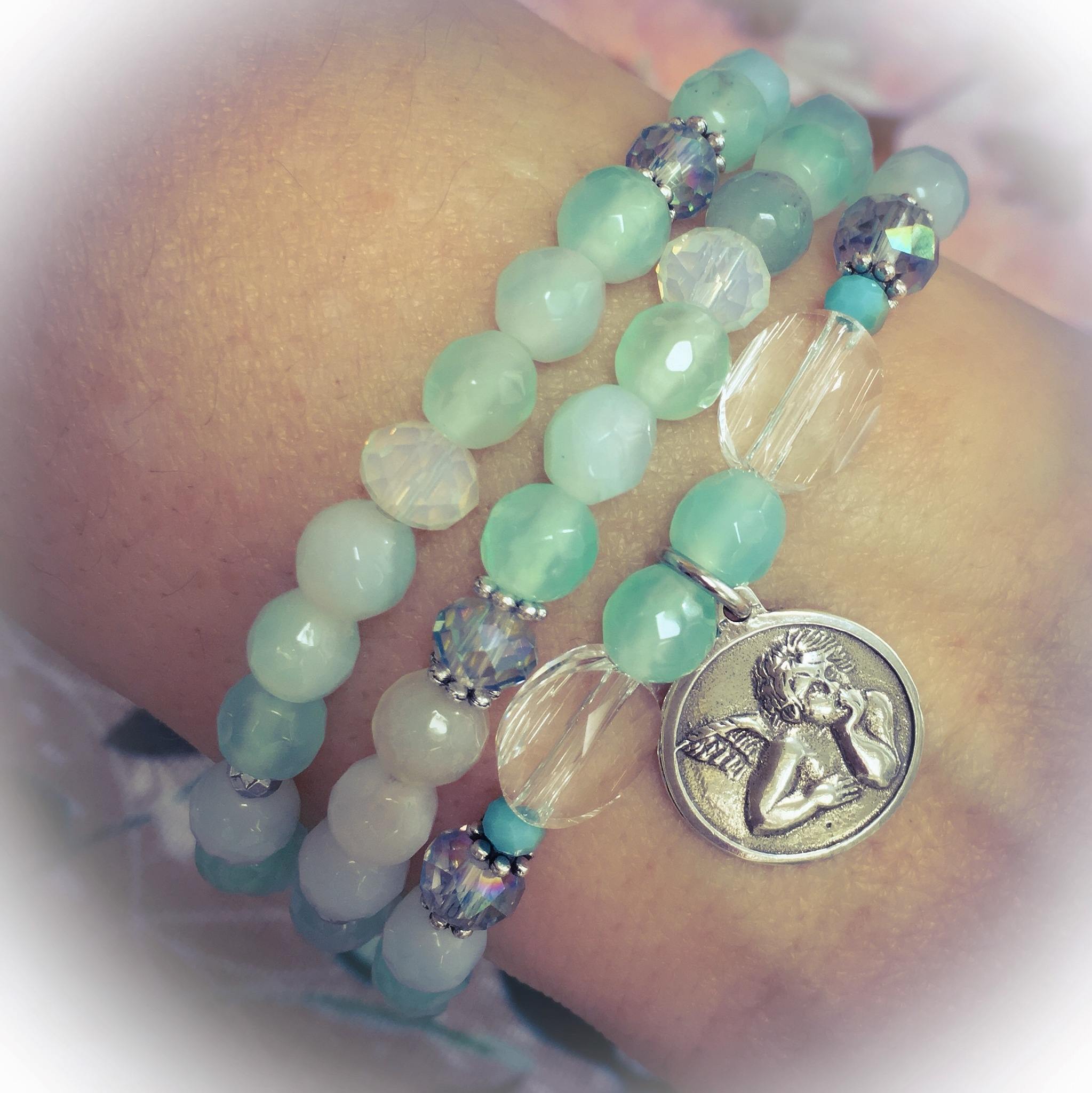 Faceted Summer Aqua Agate Gemstones surround an Italian 925 Angel Charm, while Antique Silver Accents, Czech Iridescent and Opalite Gemstones add the perfect highlights. Luminous Swarovski Gemstones are featured. Wraps three times around the wrist with Top Quality Jeweler’s Stretch Cord.