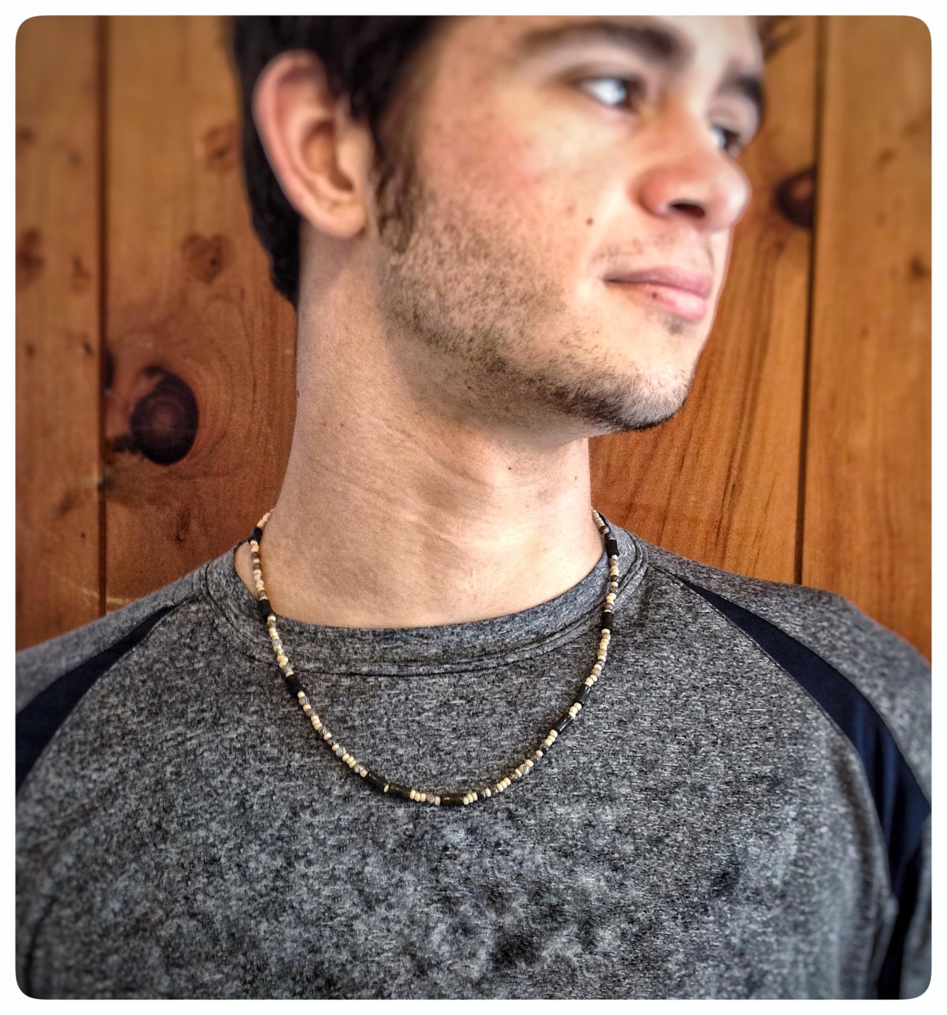 Strung on a cotton/nylon blend thread for flexibility and durability are tan glass “dashes” and tiger jasper “dots”, all spaced by cream colored seed beads. The clasp in the back is a small lobster clasp. Total length is 22″