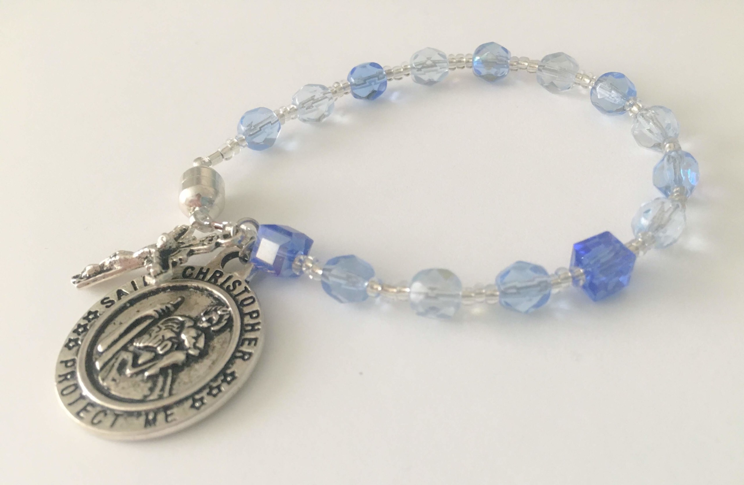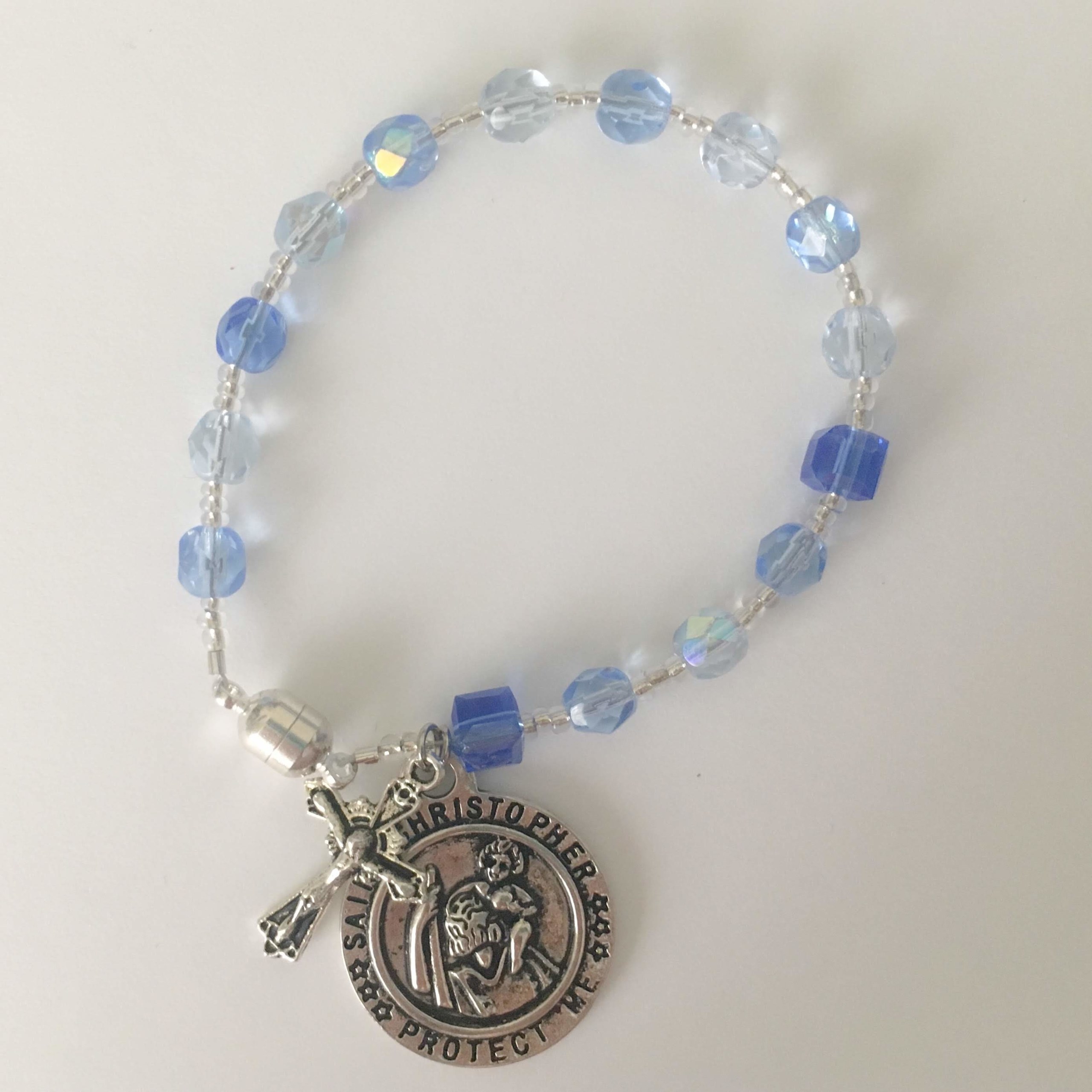 Features a dangling St. Christopher medal and crucifix.
