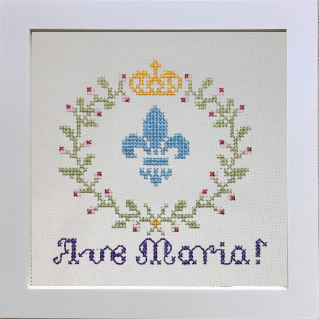 Cross stitch pattern celebrating Our Lady with roses, crown and fleur de lis and the words Ave Maria!