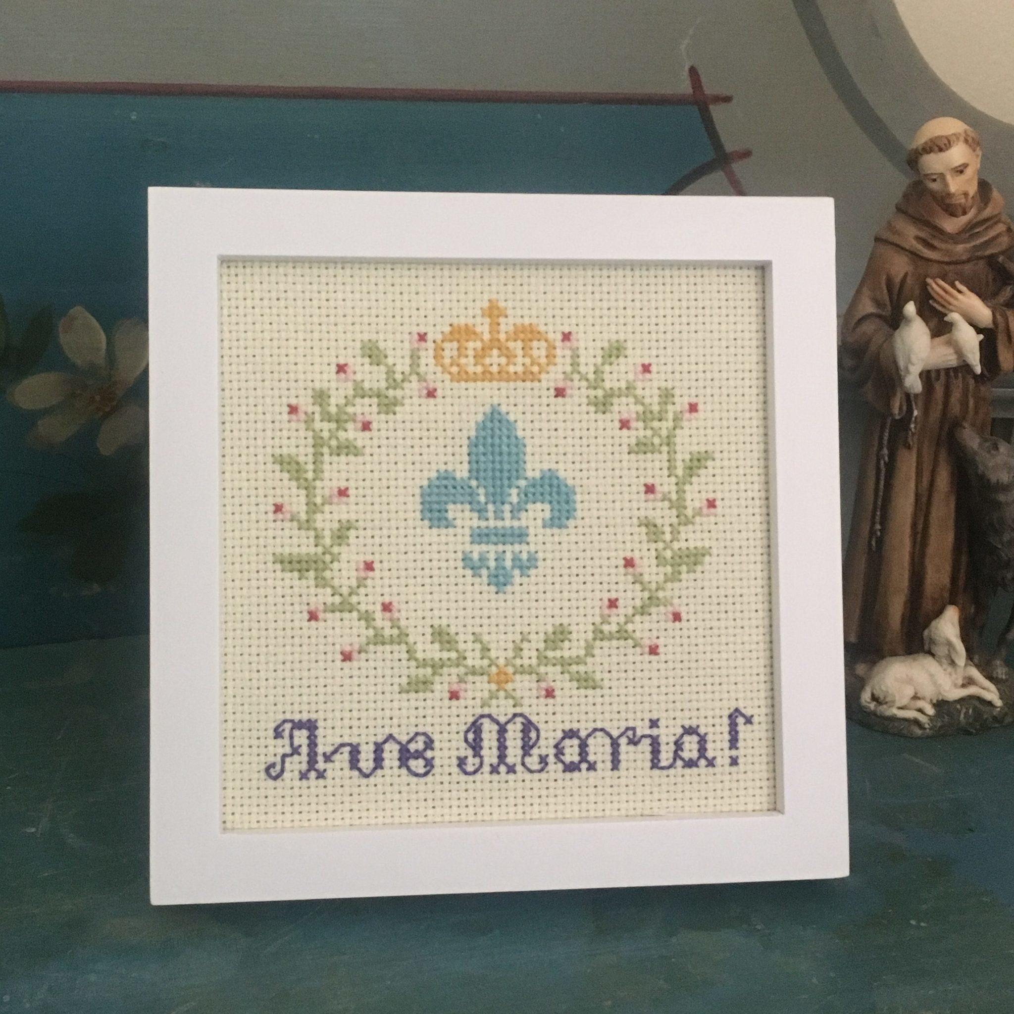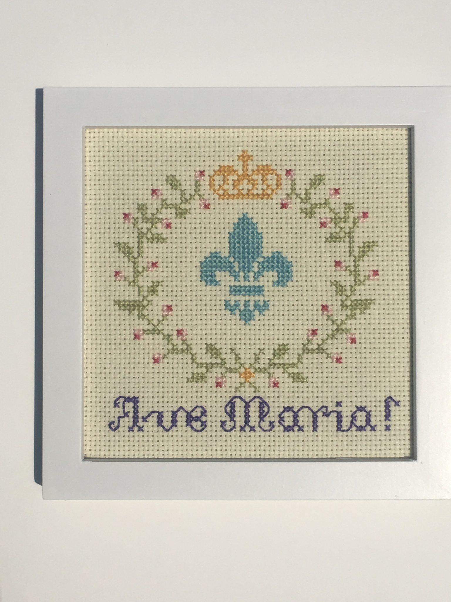 This pattern employs a brightly colored palate on a soothing ivory background. The Angelic Salutation to Our Lady and her Queenship are symbolized with roses, crown and fleur de lis with the word Ave Maria! You’ll love stitching this sweet and simple cross stitch pattern.