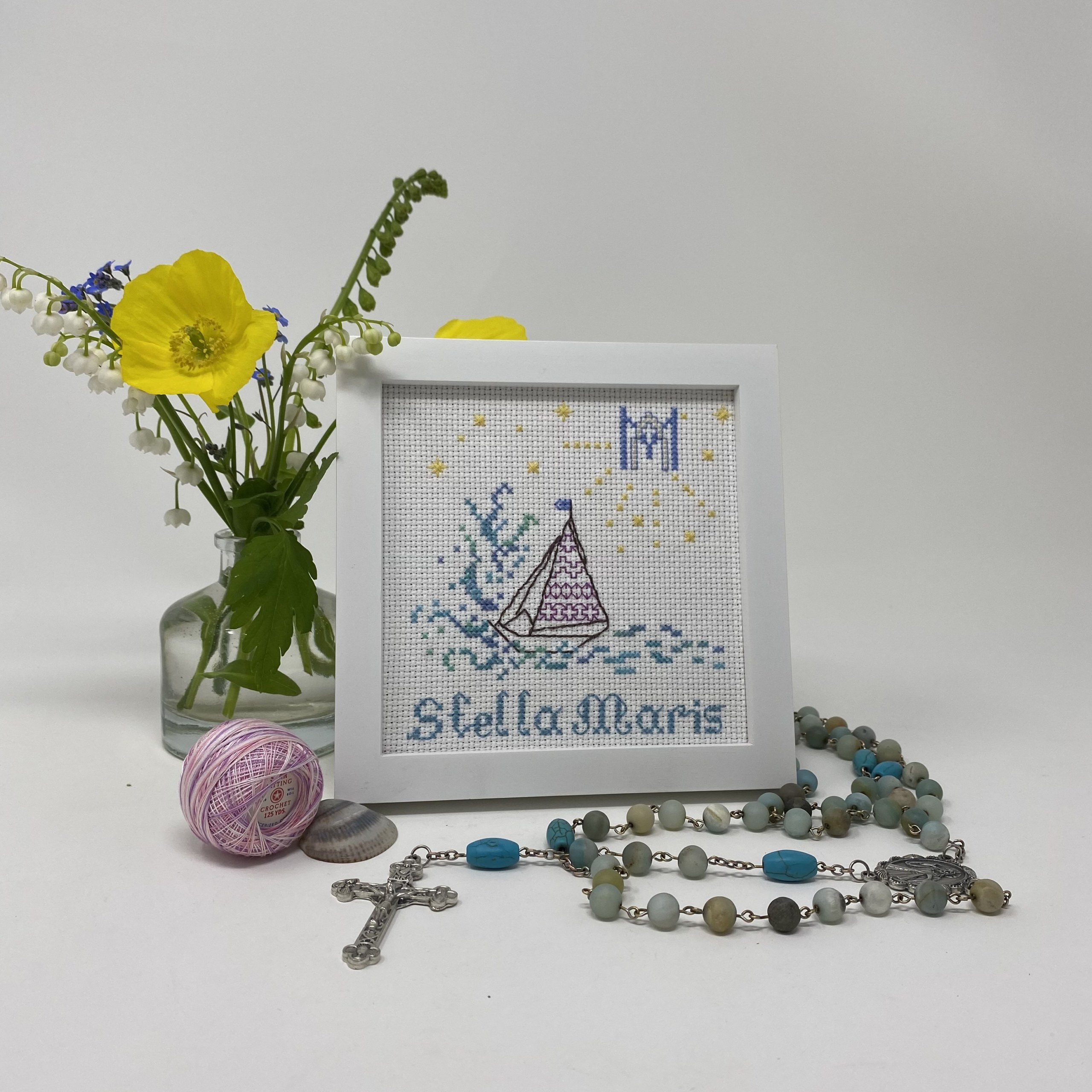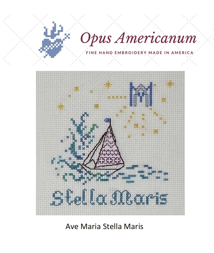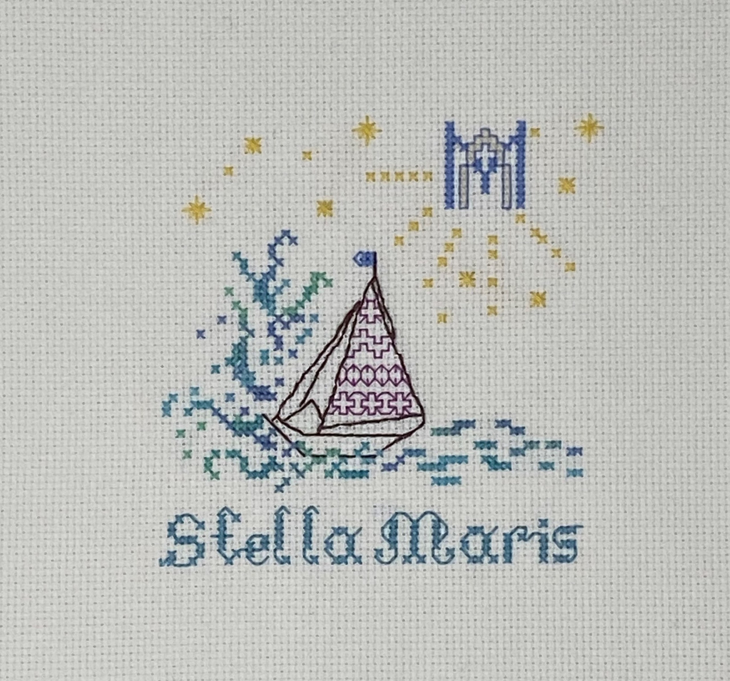 Our Lady Star of the Sea in cross stitch of azure blues and turquoise. The Ave Maria monogram lights the way and calms the turbulent waters. The holy name of Mary is our guide star on the way to Christ in all circumstances, especially in tough times and rough seas. A beautiful pattern to stitch for yourself or friend who has a love for the water and has a devotion to this title for Our Lady. Design is based on a ceiling fresco from the National Shrine of the Divine Mercy in Stockbridge, Massachusetts.