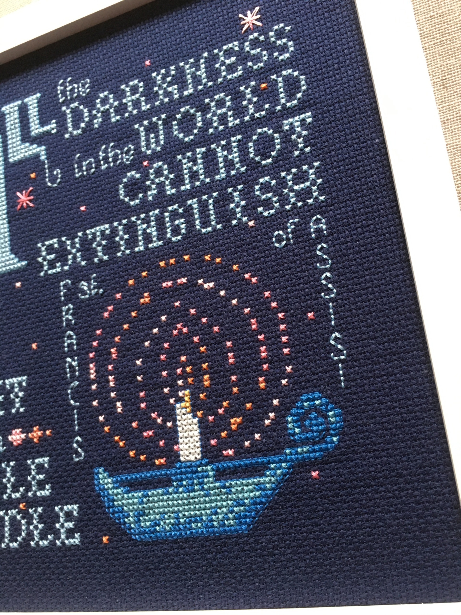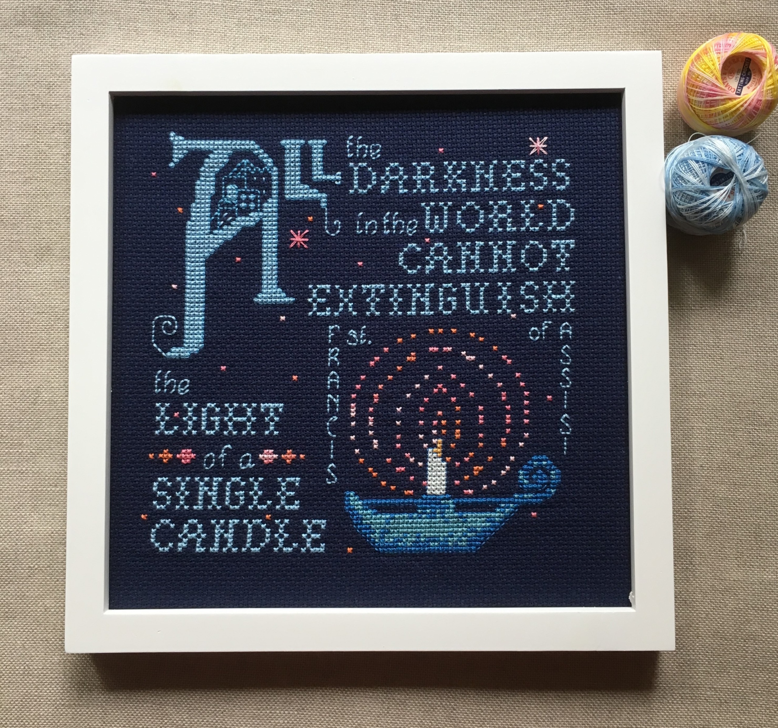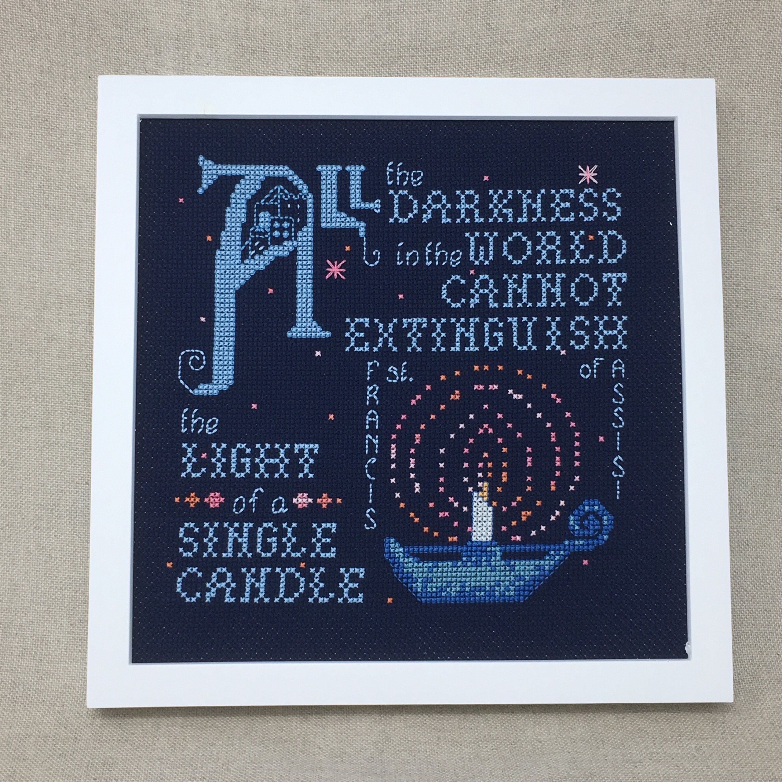 Saying of St. Francis “All the Darkness in the World Cannot Extinguish the Light of a Single Candle” stitched on 14 count navy aida cloth.