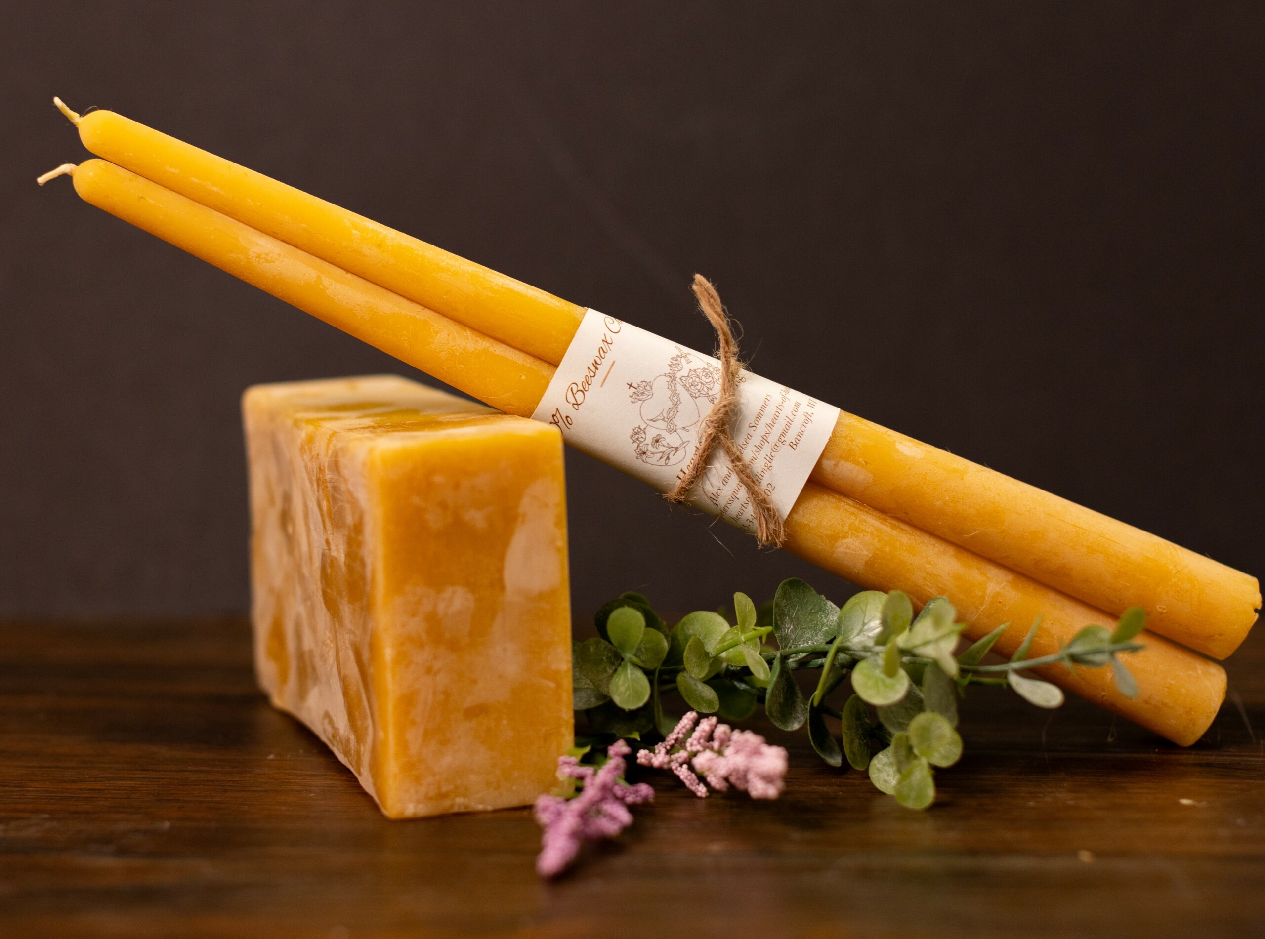 These 100% beeswax candles are hand poured from locally sourced wax which has a delightful aroma of honey. The candle burns for about 9 hours. It is a two candle set. The set of candles weighs 4.4 ounces