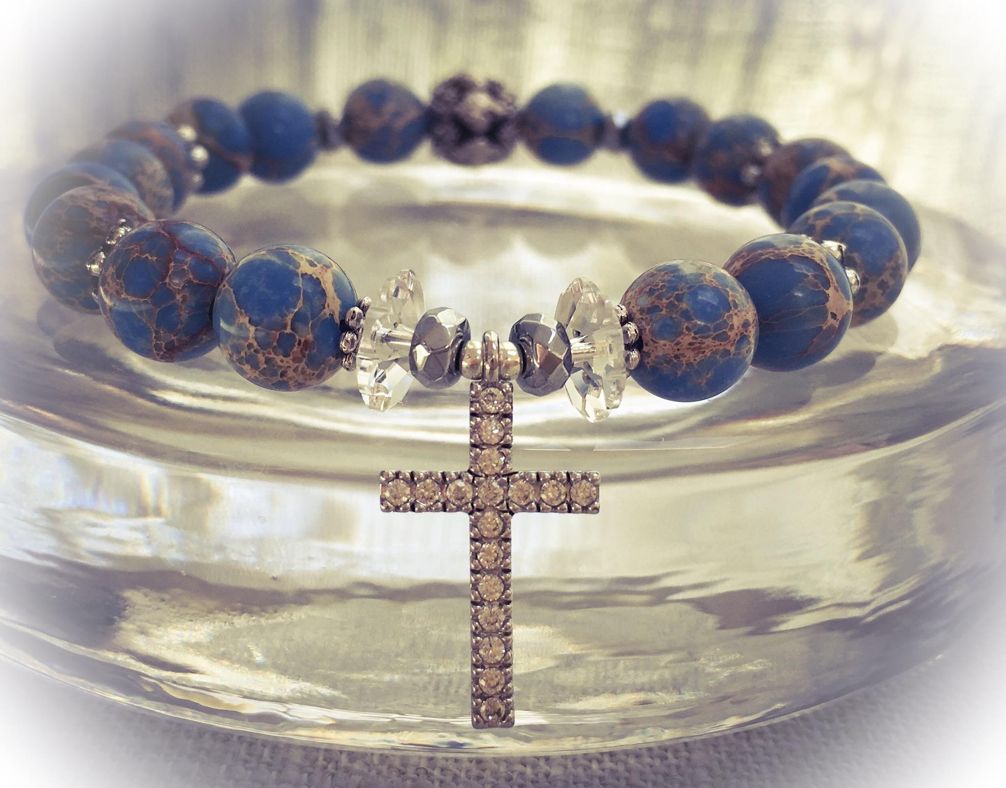 Luminous Swarovski Daisy Crystals embrace a Luminous Silver Plated CZ Cross Charm, as Impression Jasper Gemstones encircle this glorious celebration of faith.