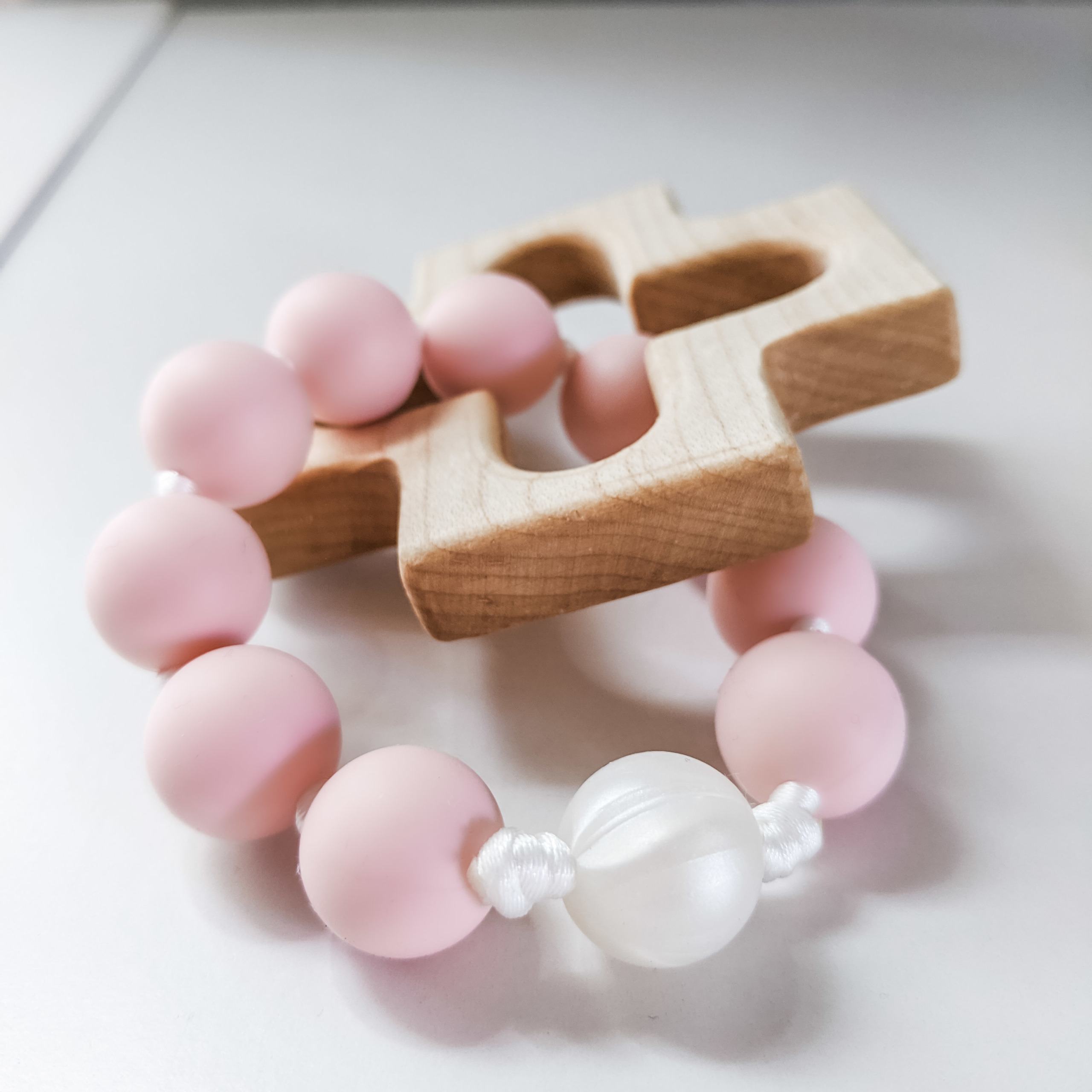 Catholic Baptism Gift for Baby Girl – Pink and Pearl Teething Rosary Ring