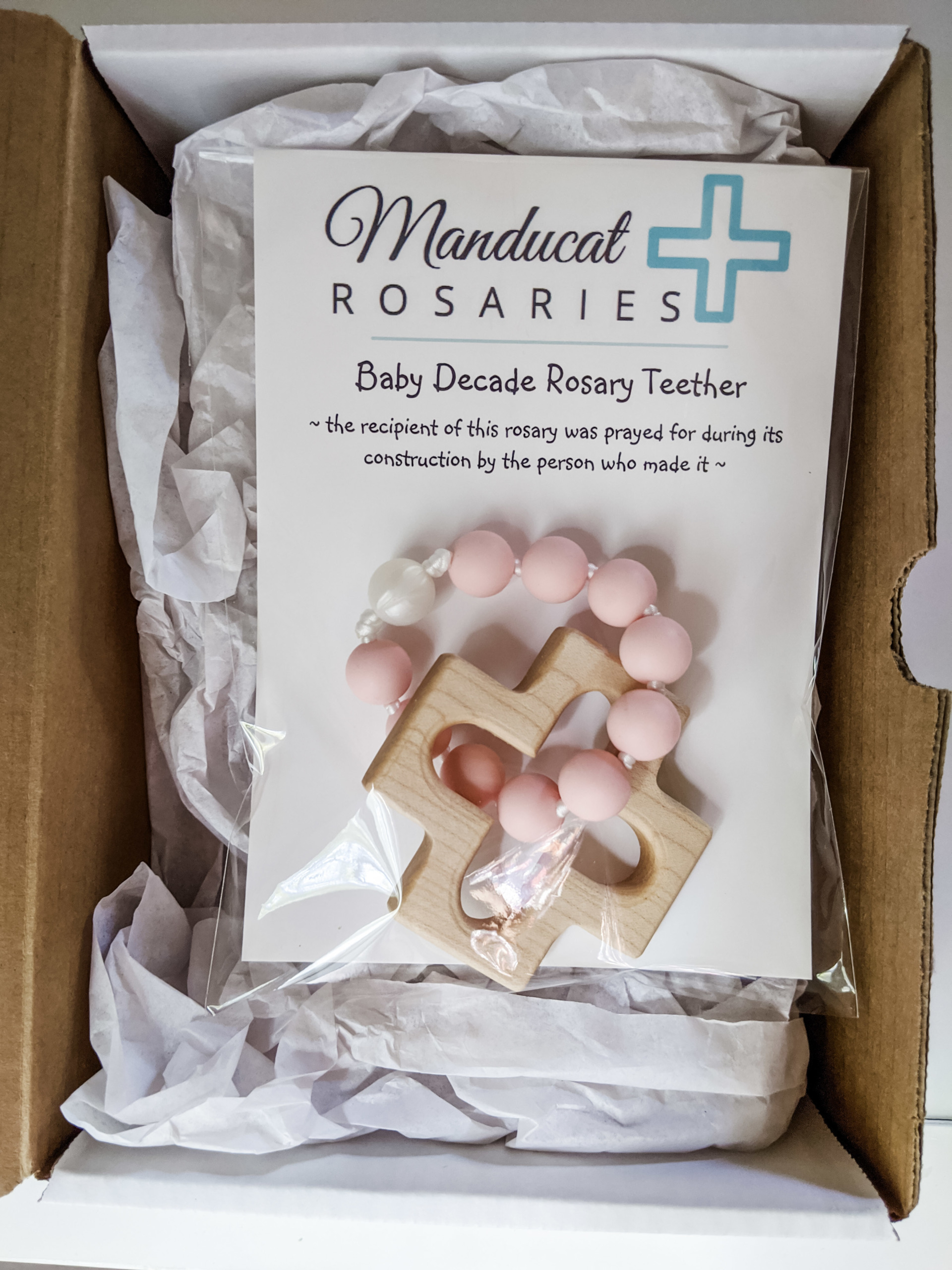 I named my shop when the only items I carried were the teething rosaries. “Manducat” is Latin for “he/she/it chews.” The inspiration for my shop name came from the words, “manducat Dominum,” (often translated as “he consumes the Lord,” or some other more mild verbage) from the beautiful song, Panis Angelicus. This word, with its Catholic connotation and literal translation, seemed appropriate for teething rosaries and Catholic teething toys.