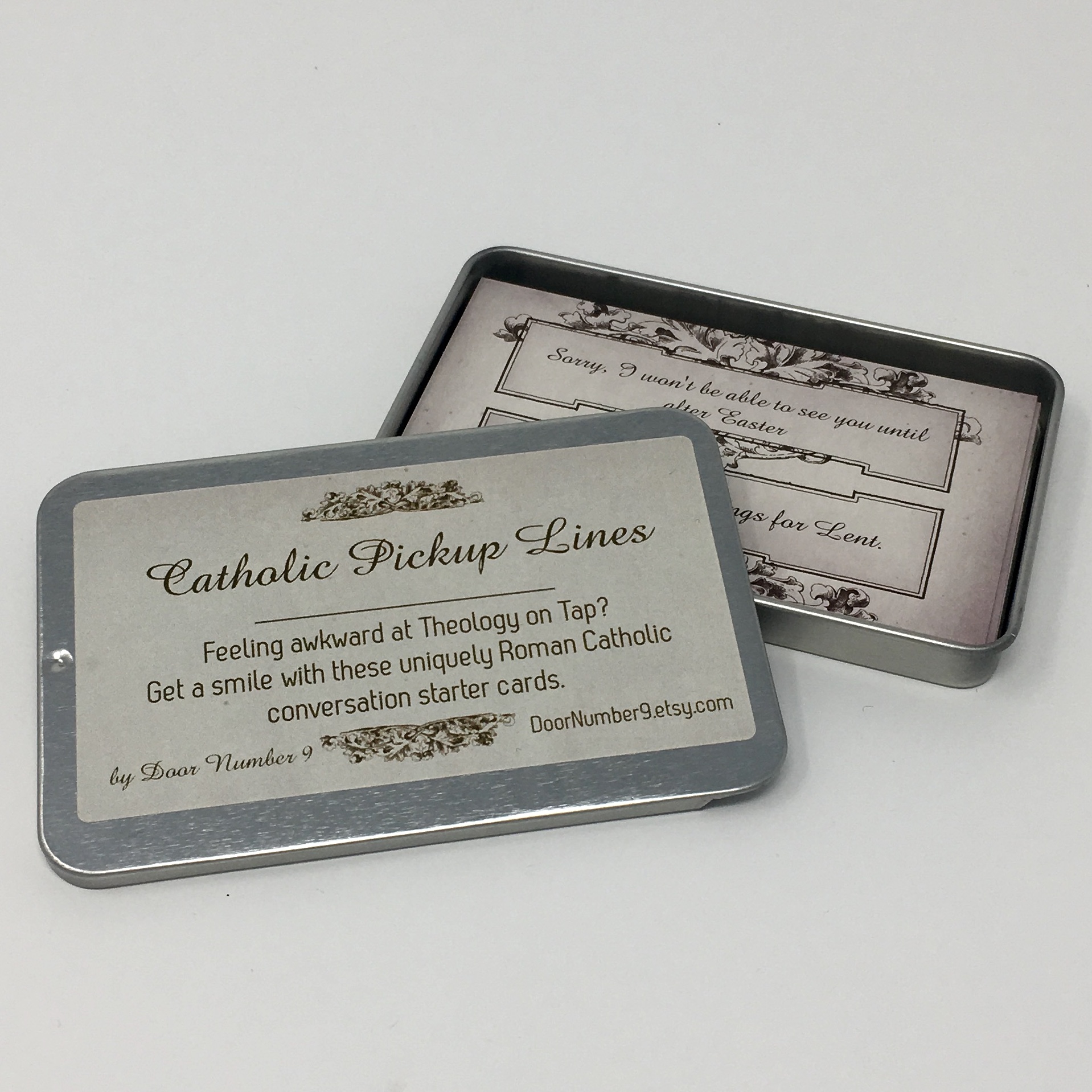 Here are the classic Catholic pick-up lines, now printed on 2.5×4 inch cards. Carry them with you inside the included slide-top metal tin so you can smoothly operate the top and slide out one of sixteen suggestions such as “Confess here often?”