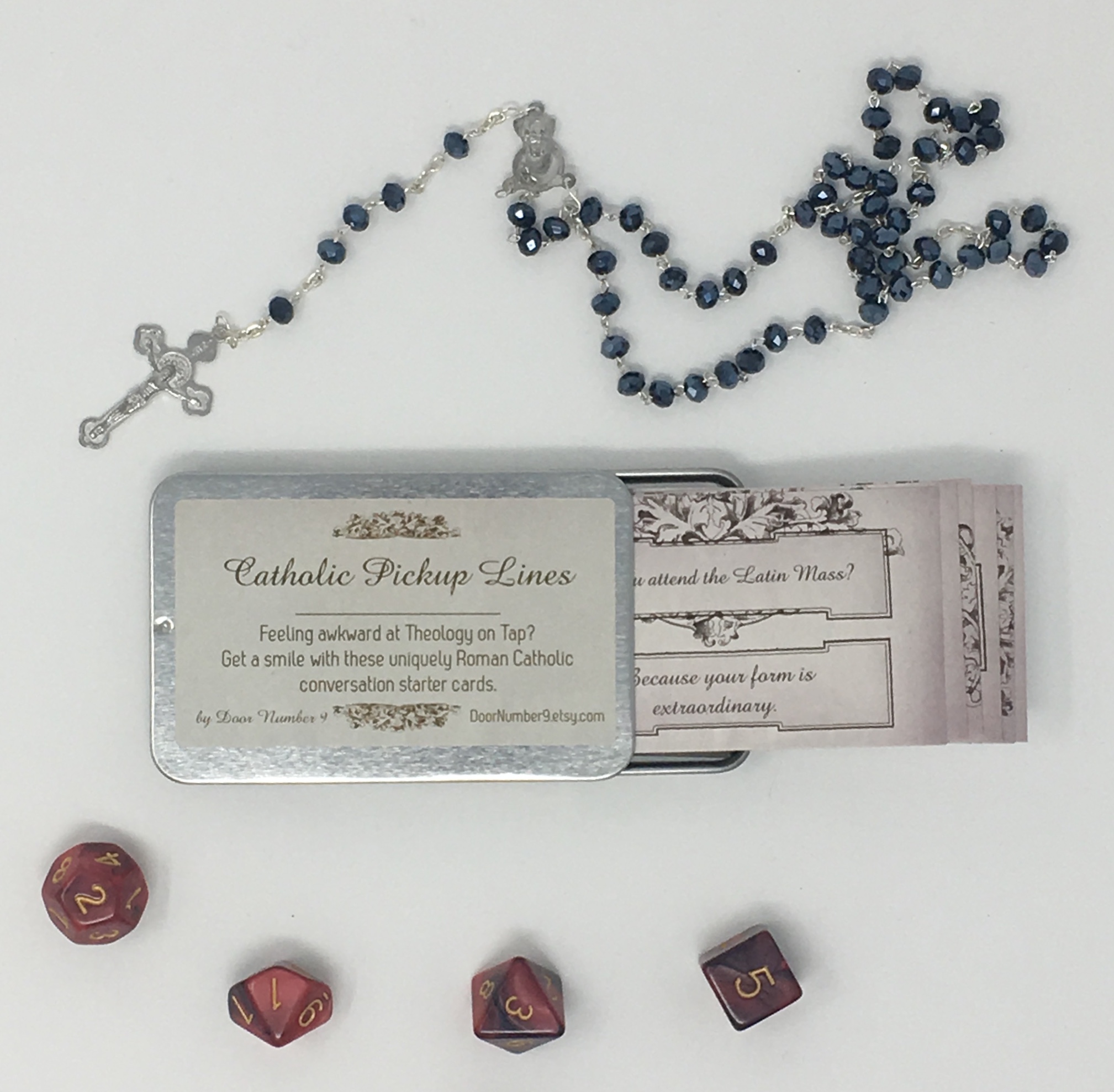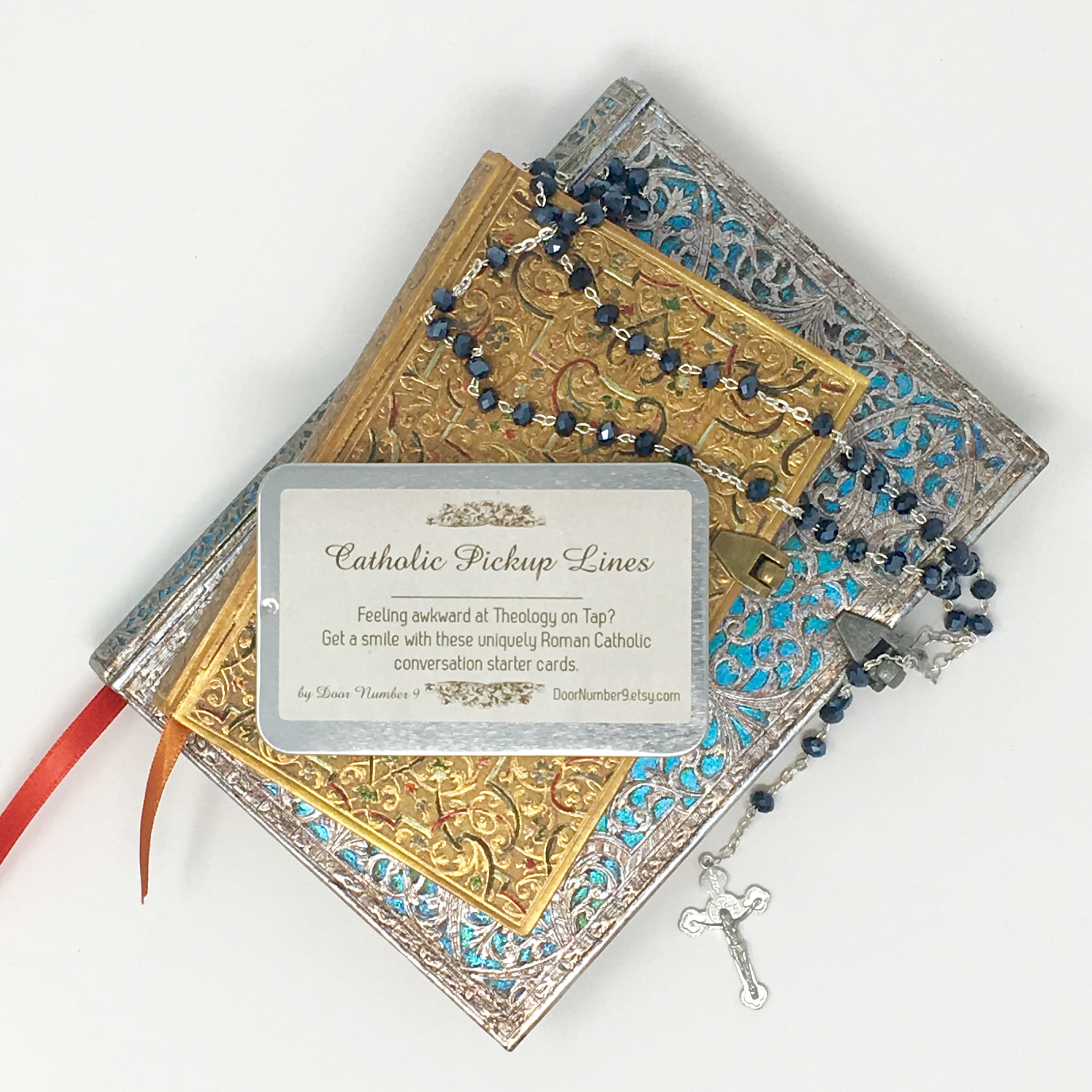 Here are the classic Catholic pick-up lines, now printed on 2.5×4 inch cards. Carry them with you inside the included slide-top metal tin so you can smoothly operate the top and slide out one of sixteen suggestions, including: “Confess here often?”; “Your eyes are so [Marian blue, Carmelite brown, or Ordinary Time green]”; and “Do you attend the Latin Mass? Because your form is Extraordinary.”