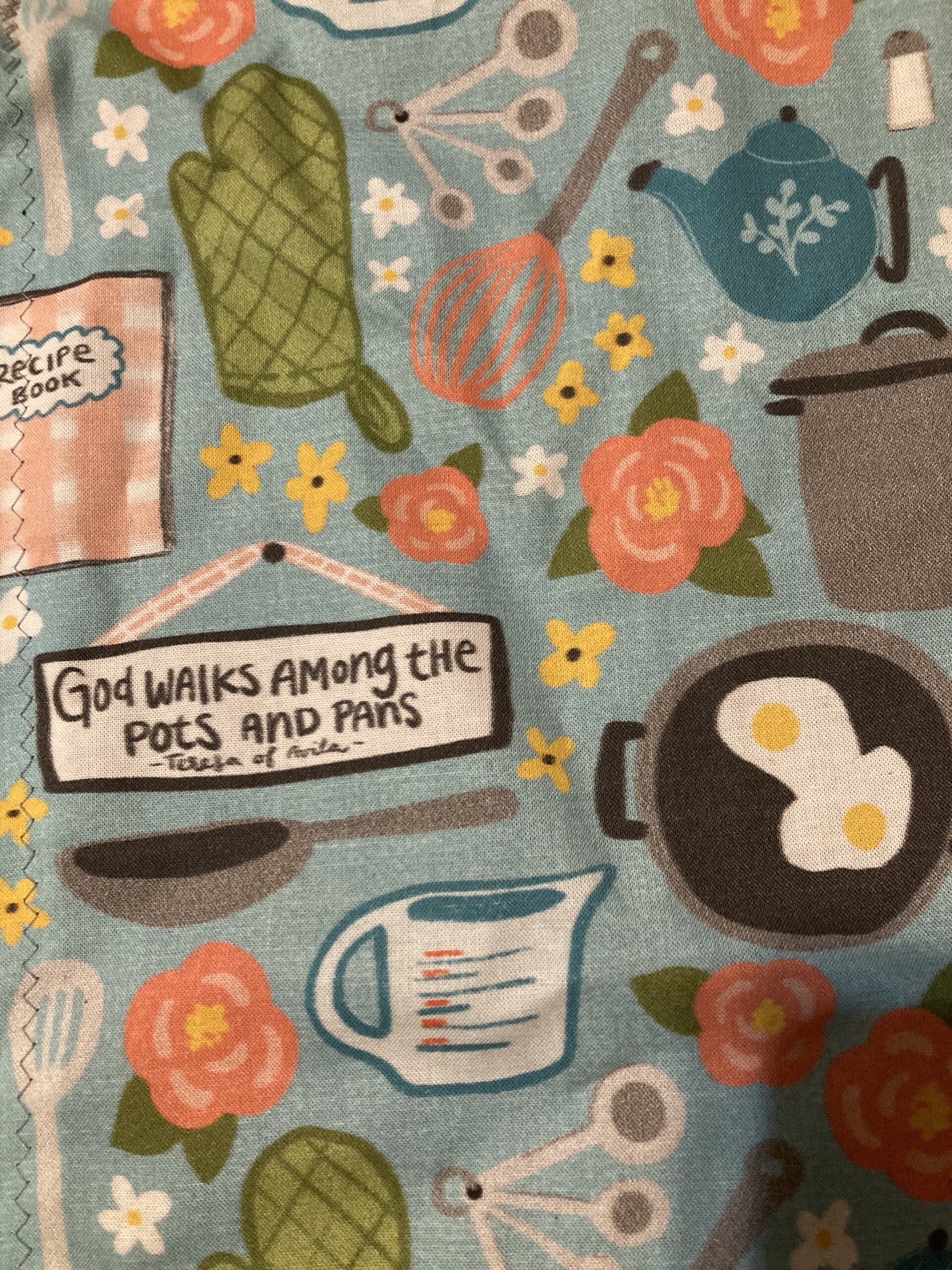 Give your mother’s helper a cute apron to wear in the kitchen! With Catholic prayers on the print, you can’t go wrong. Fits 5-7 years.