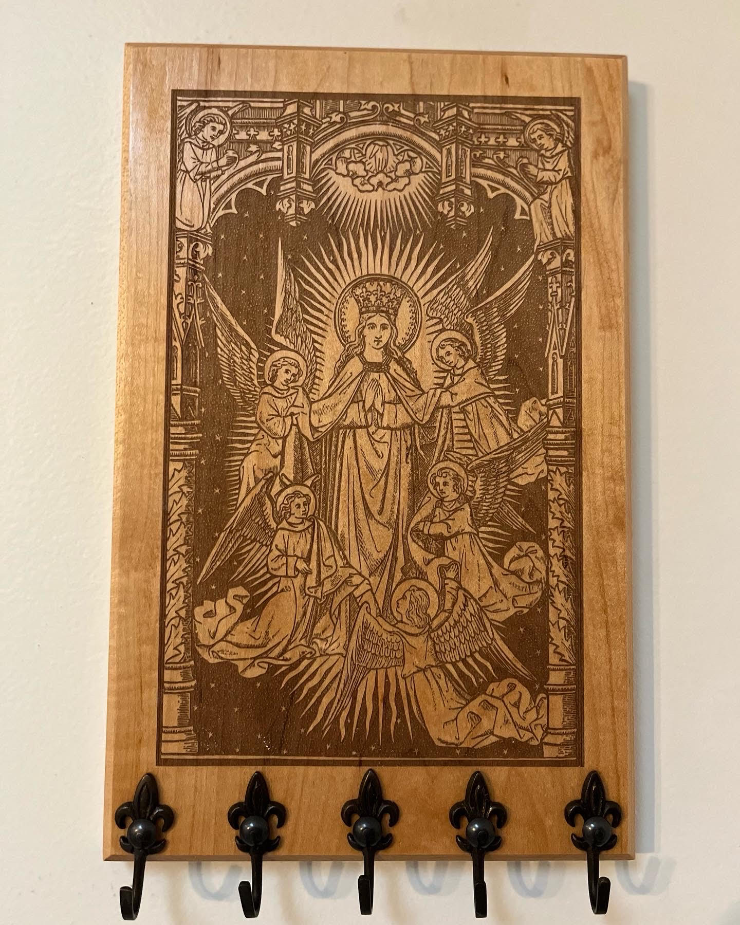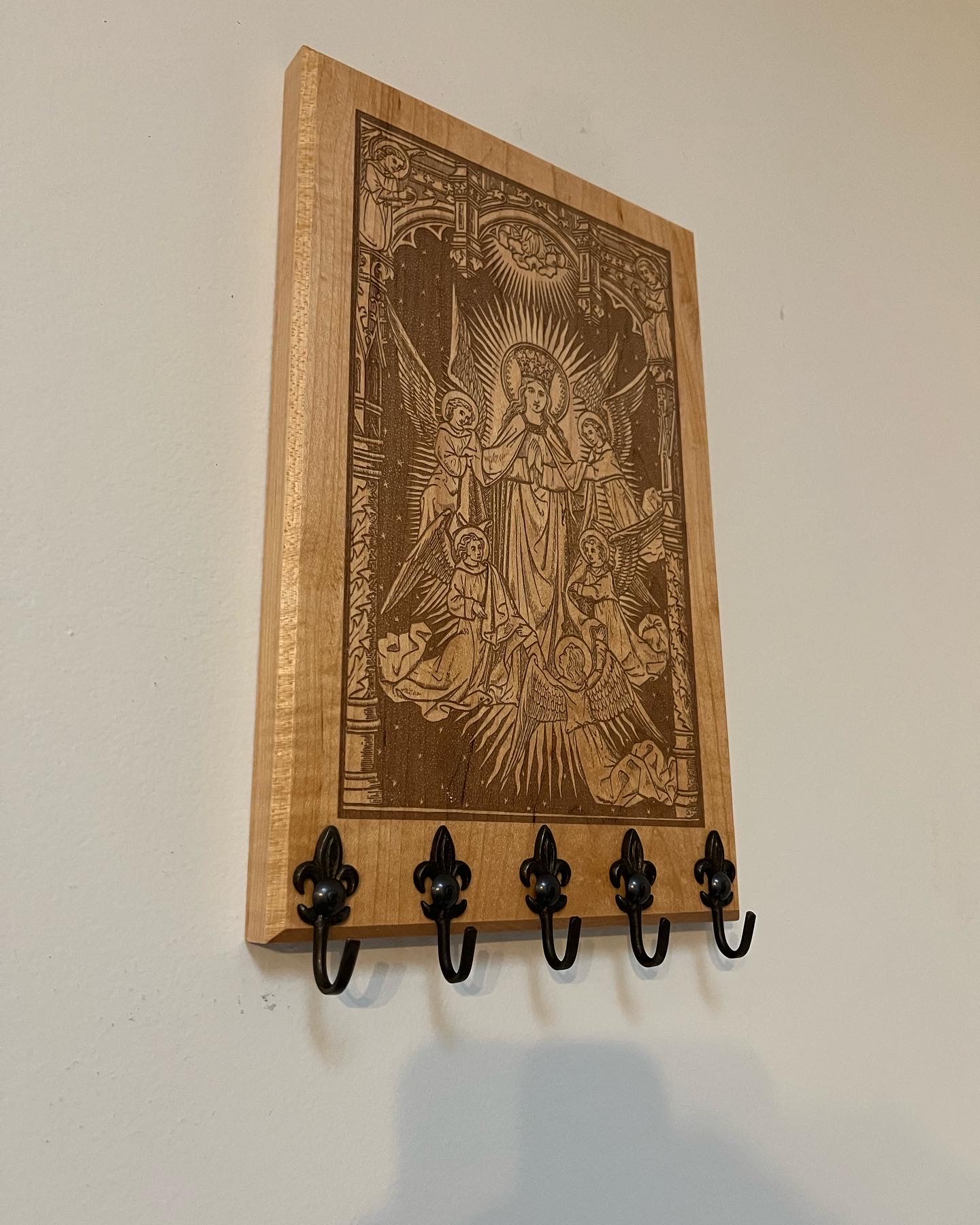 Stunning rosary hanger ( can hold up to 5 hooks) depicting the Coronation of the Blessed Mother!