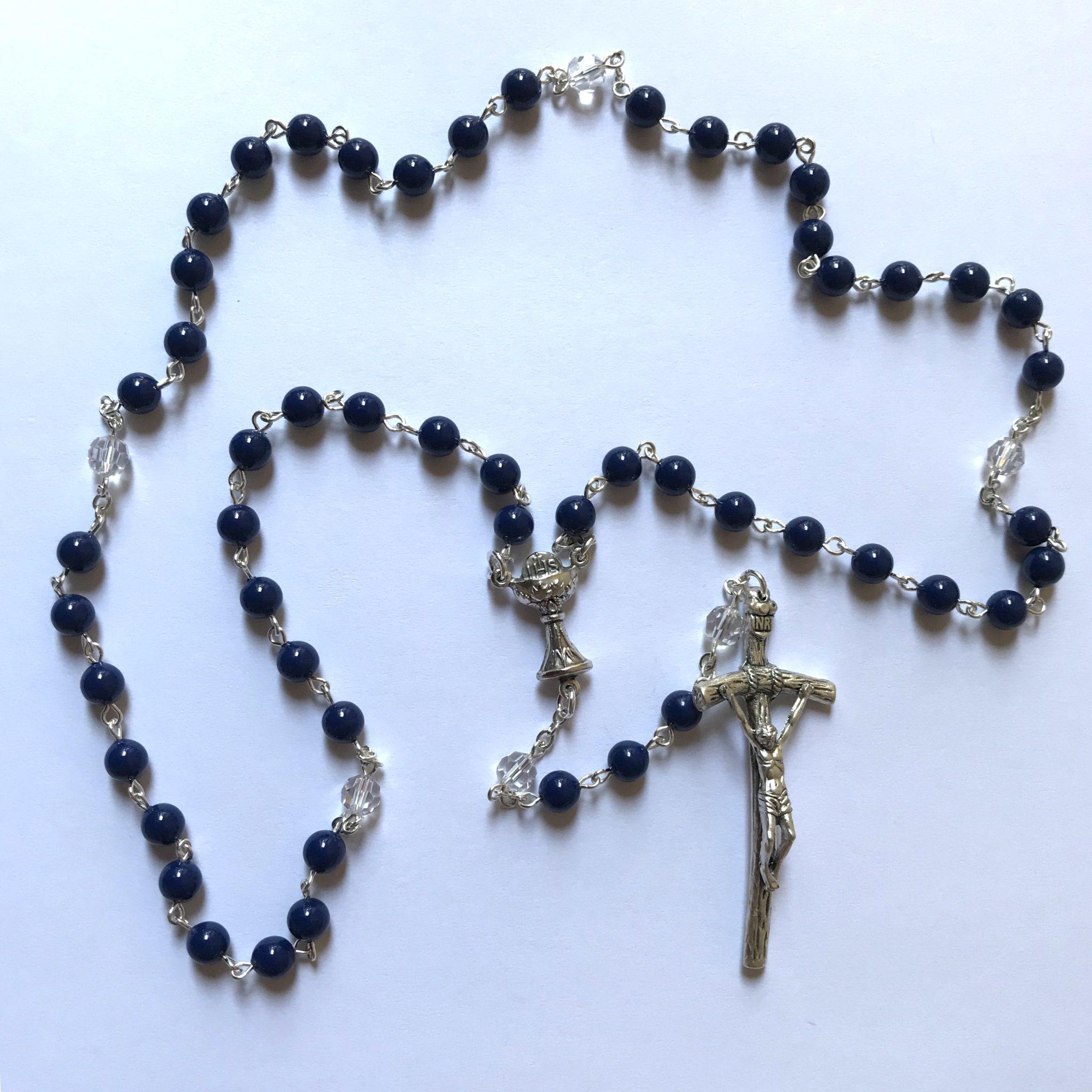 Dark Blue Lapis Swarovski pearl and crystal round silver Chalice rosary