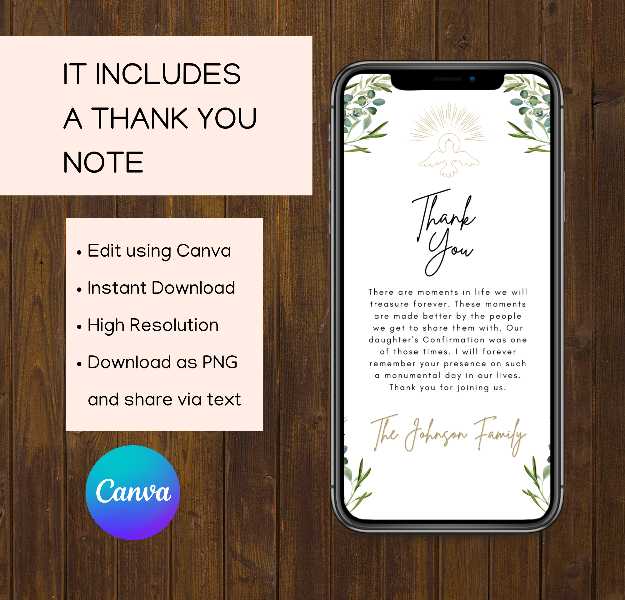 Digital Confirmation Invitation Digital Confirmation Invitation Template Canva Editable Thank You Note Catholic Gold Greenery Boho