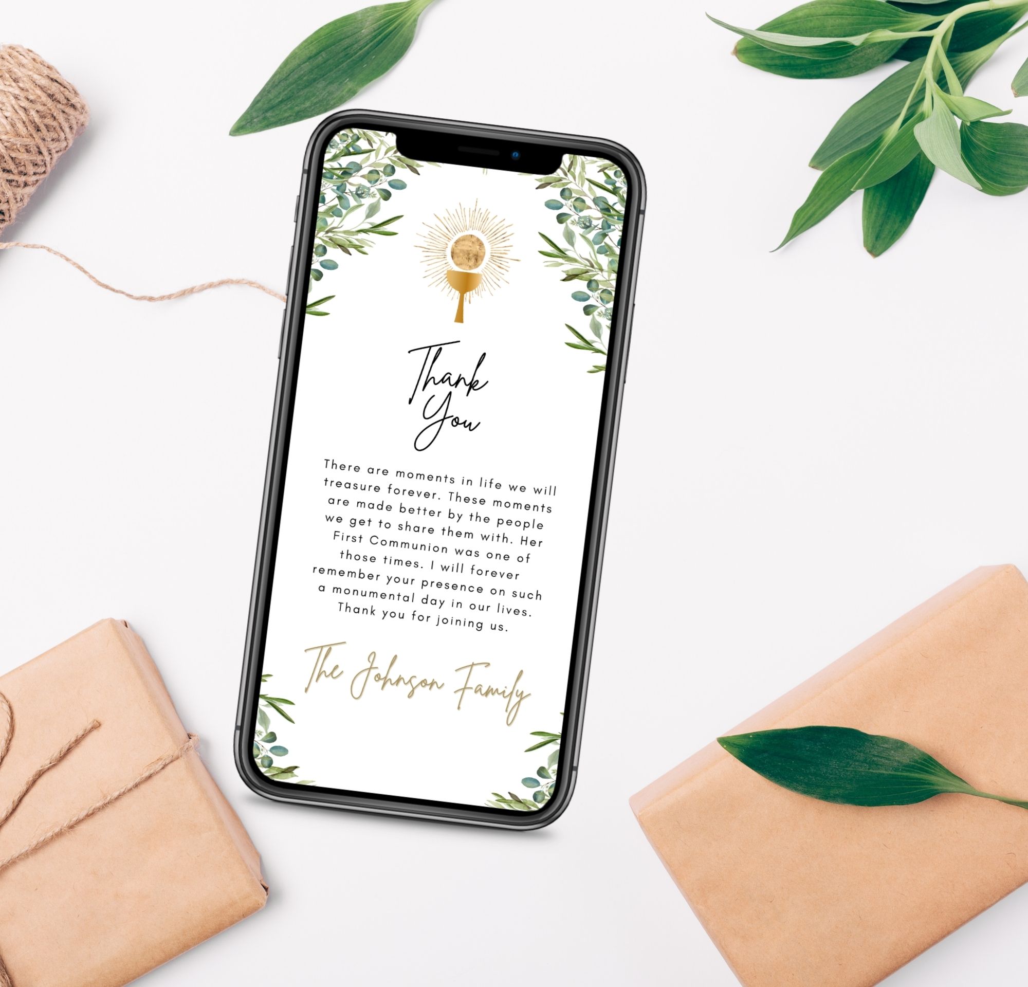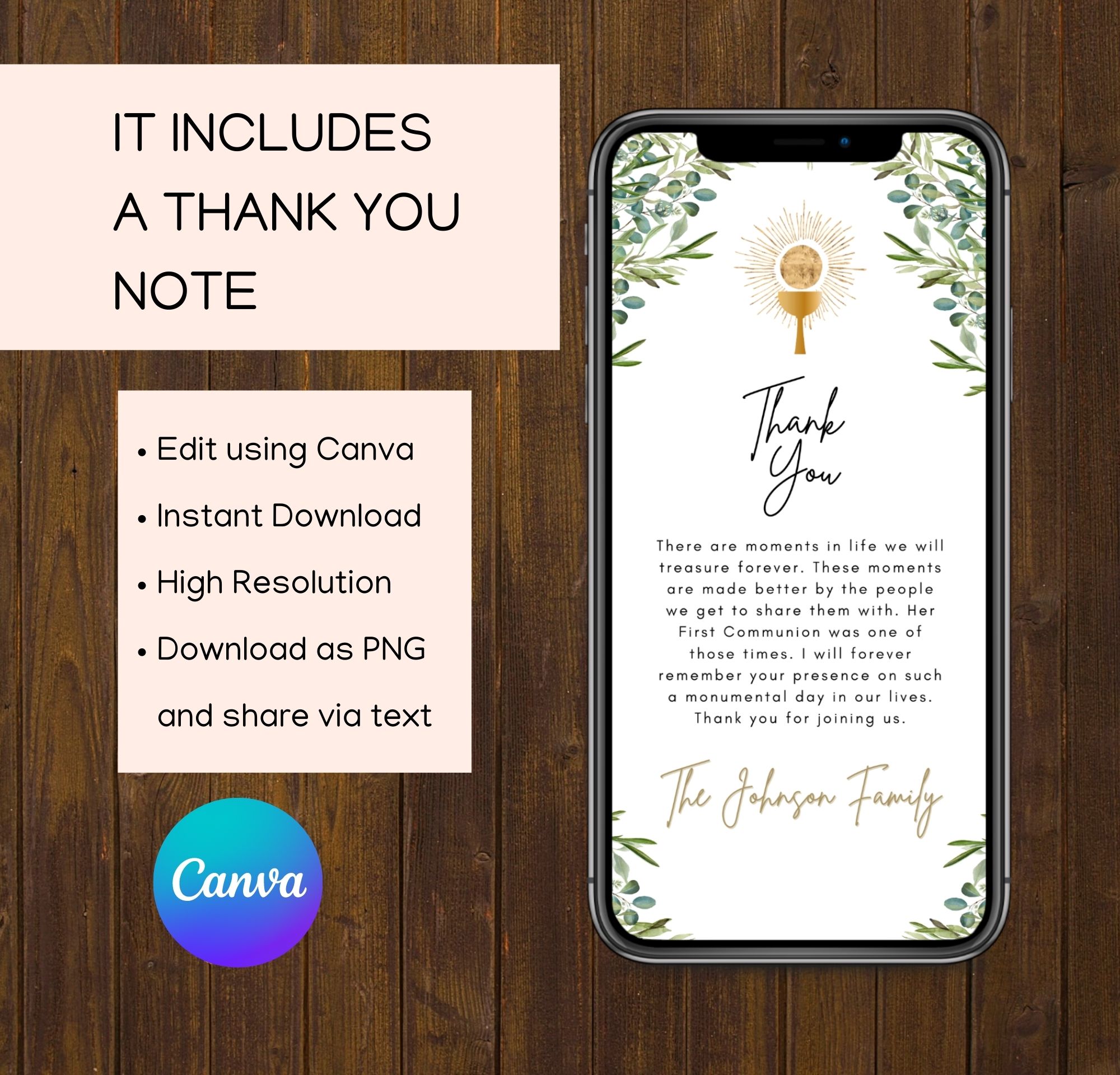 Digital First Communion Invitation Digital Communion Invitation Template Canva Editable Thank You Note Catholic Gold bohemian