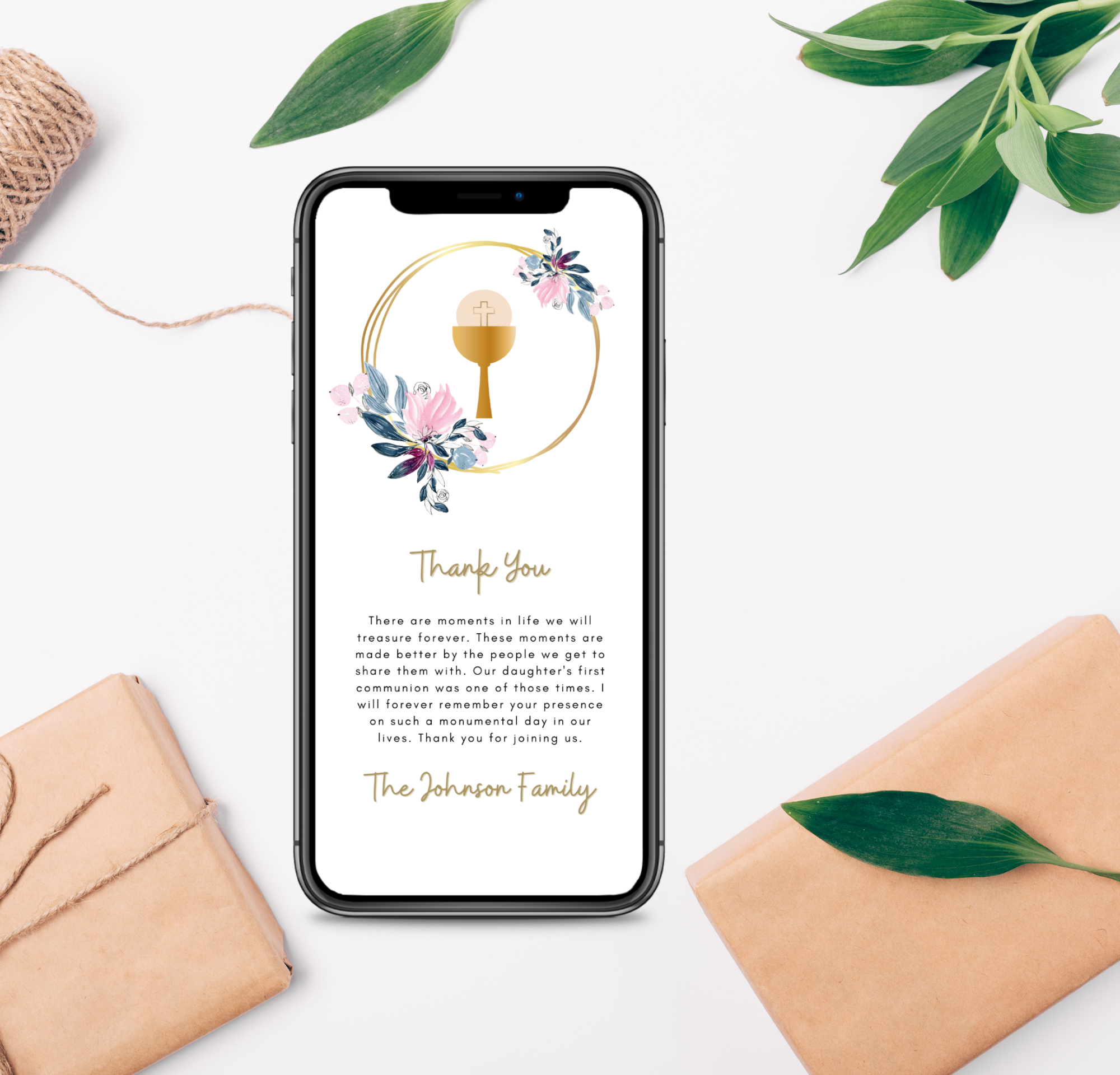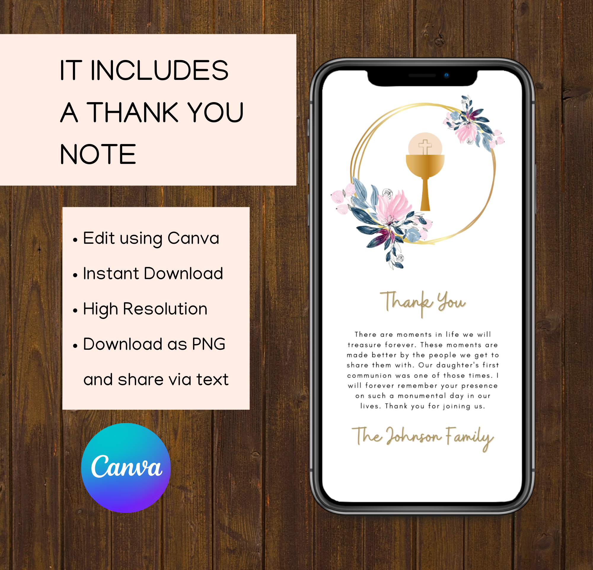 Digital First Communion Invitation Digital Communion Invitation Template Canva Editable Thank You Note Catholic Gold spring colors Girl