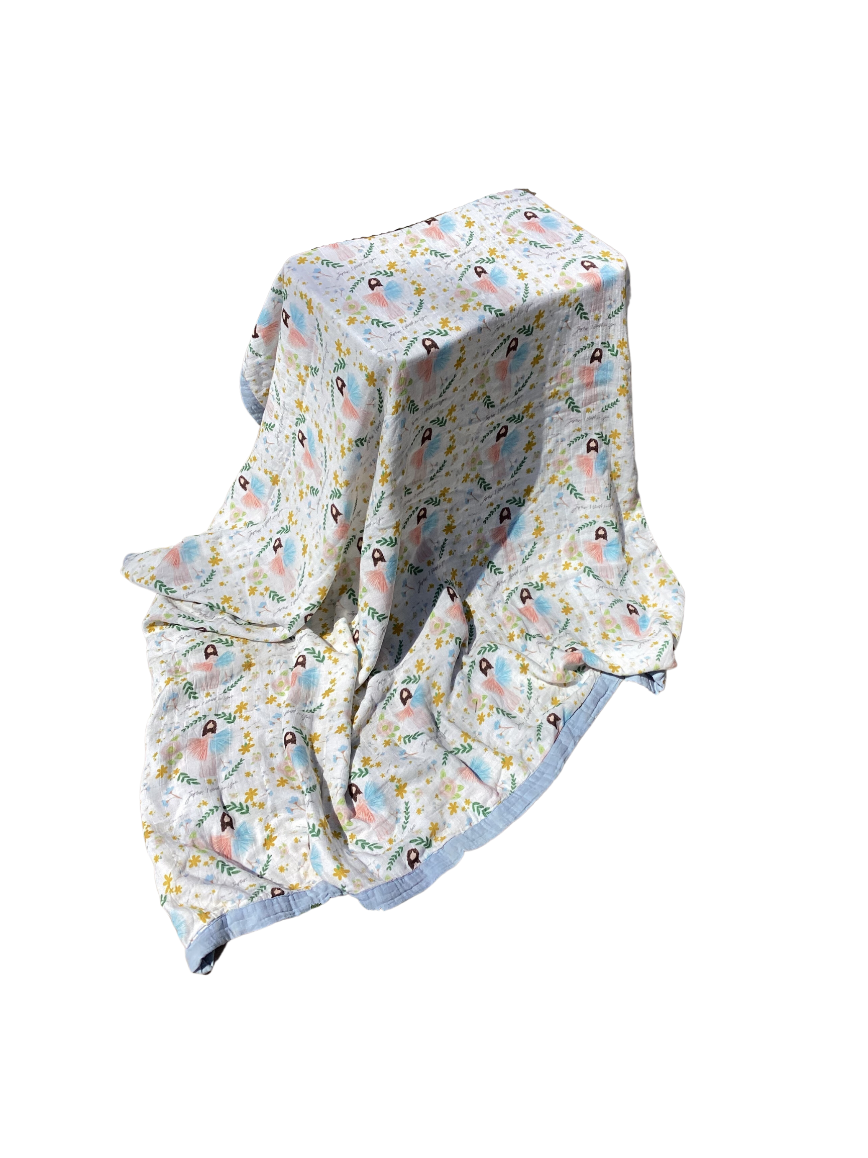 ULTRA soft muslin bamboo/cotton blanket with the Divine Mercy image is the BEST for swaddling, cuddling or nursing your little one. The lightweight breathable fabric is perfect for your little one!