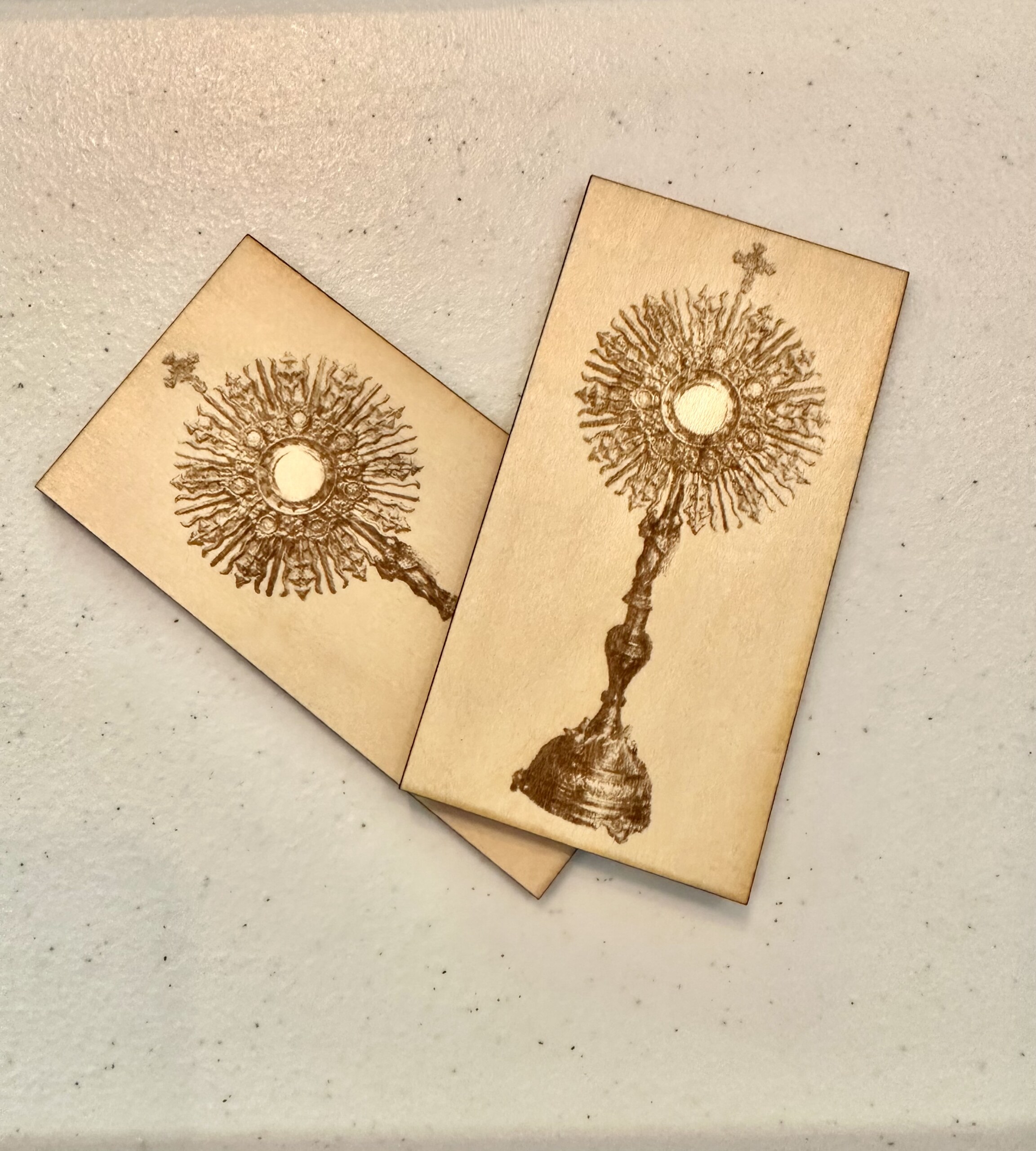 Laser-burned Monstrance image on basswood. Approx 41/2 inches x 2 1/4 inches. Attach a magnet or adhesive to the back (not included)!