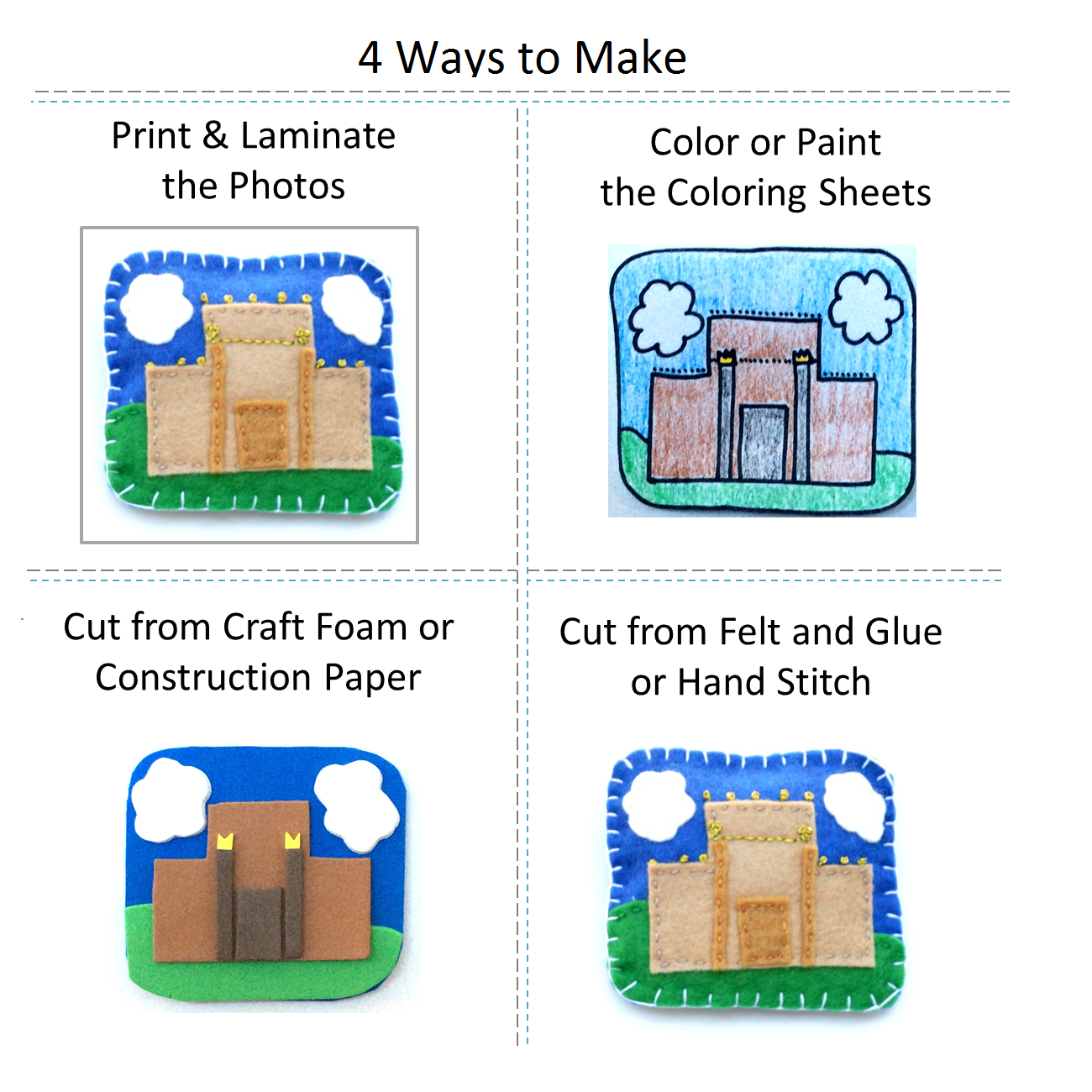 – cutting out the templates and piecing together, using construction paper and glue, craft foam and glue, felt and fabric glue or felt and embroidery floss and hand sewing