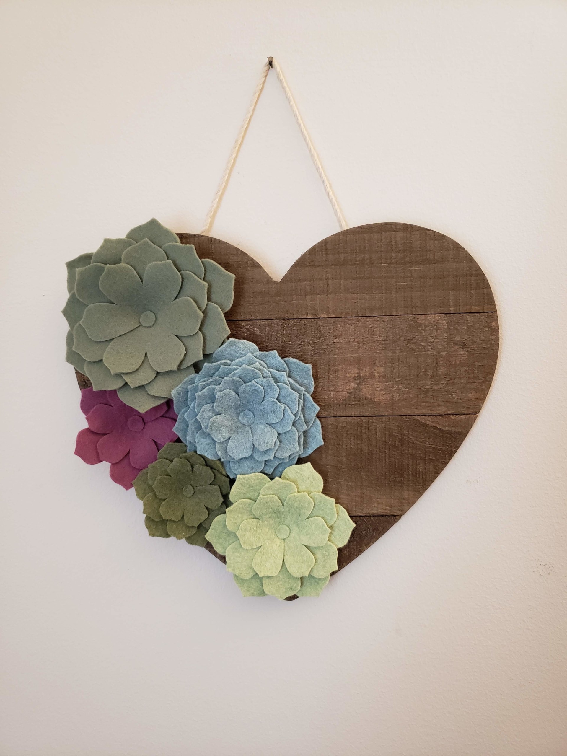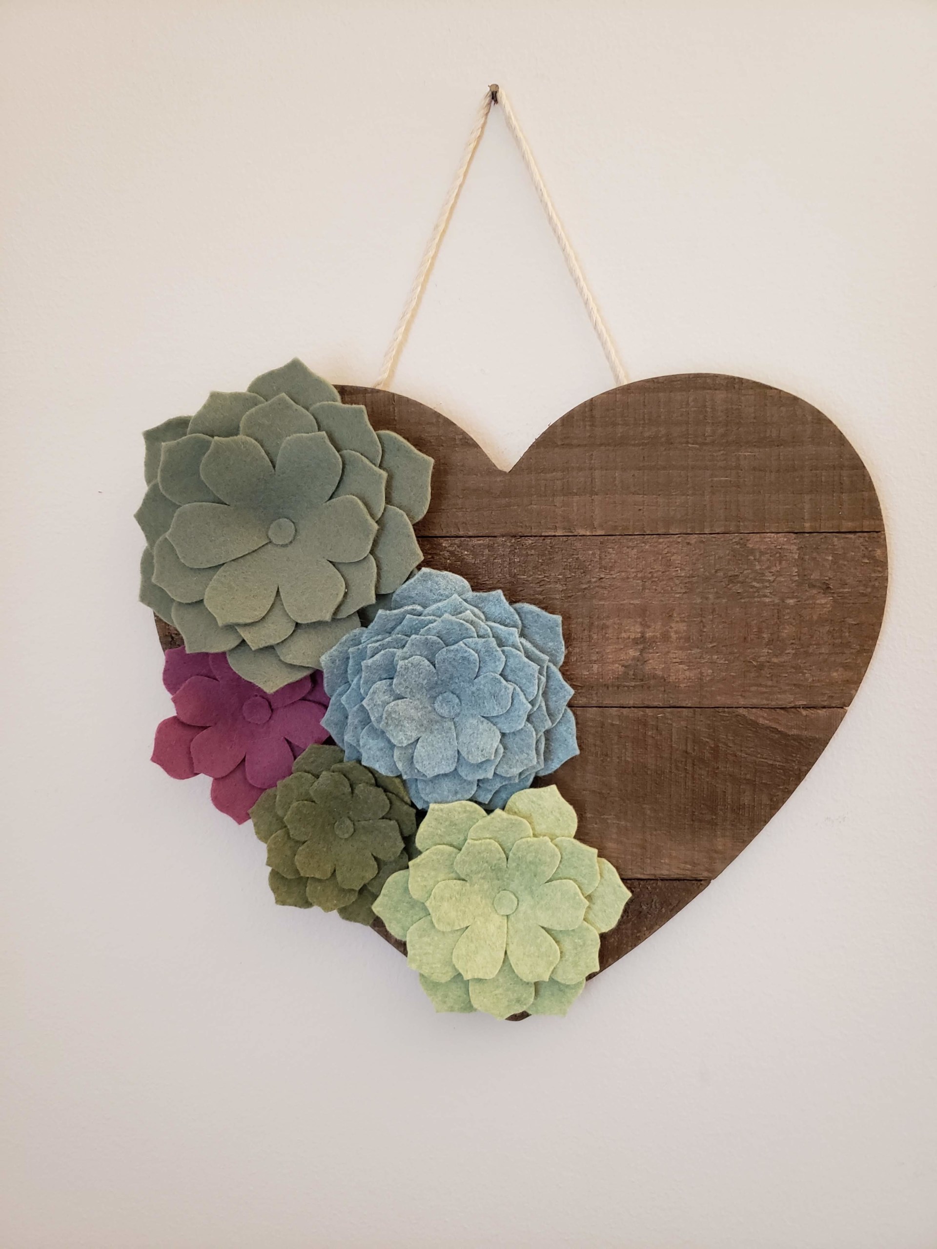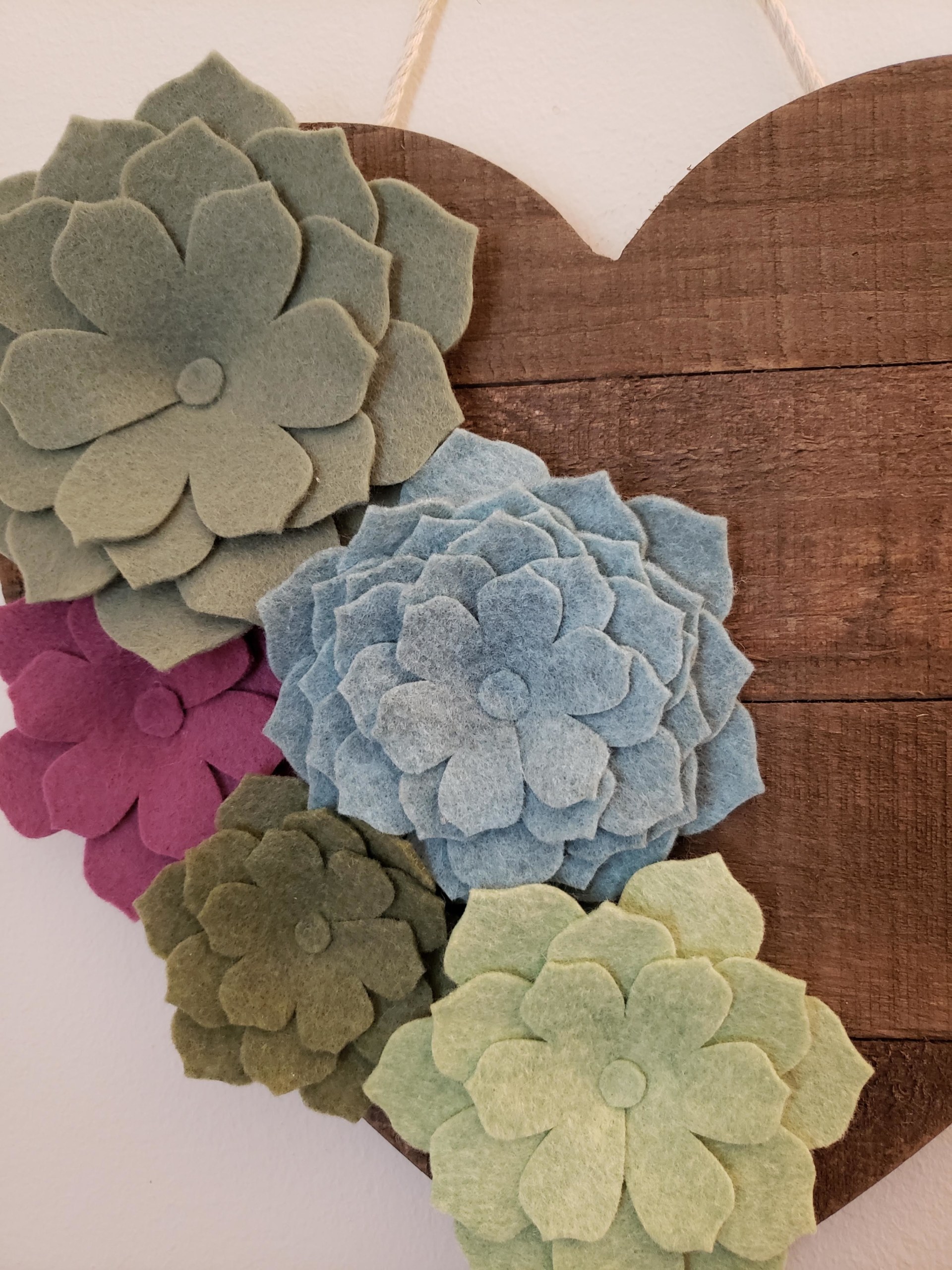 This wooden heart is decorated with handmade felt succulents. Perfect for any succulent lover, especially the ones that can’t keep real plants alive ;)