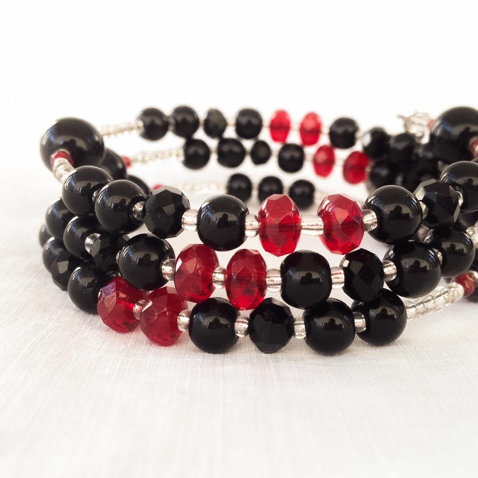 A great way to show your pride and support and a great reminder to pray for our loved ones, this Wrap-Around-a-Rosary bracelet begins with a black bead with a gold crucifix stamped on it. The body of each decade uses jet black glass beads in 6mm round and crystal rondelle, and the thin red line in the middle of each decade is represented by two transparent ruby red crystal beads. The Our Father beads are 10mm black rounds set apart by tiny red crystals. You have the option of adding a silver plated Saint Michael charm or St Florian charm.