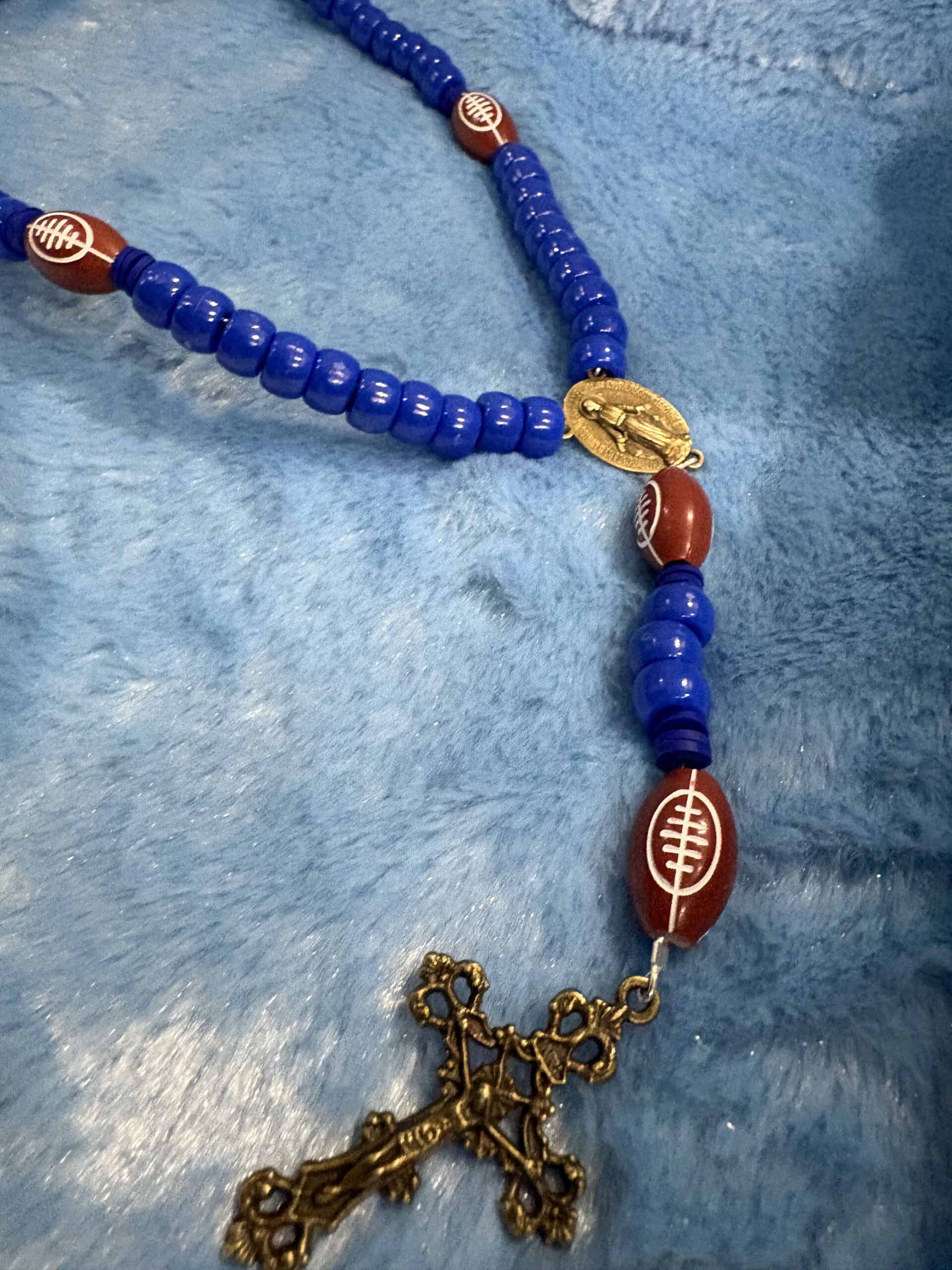 This handmade wire strung, miraculous medal rosary was inspired by my kids and husband. Their love and passion of Detroit Lions football is unmatched. My hope was that this rosary would grow their love of Mary and prayer! Message me your favorite sports team and I will do my best to make one, I also have baseballs and basketballs!
