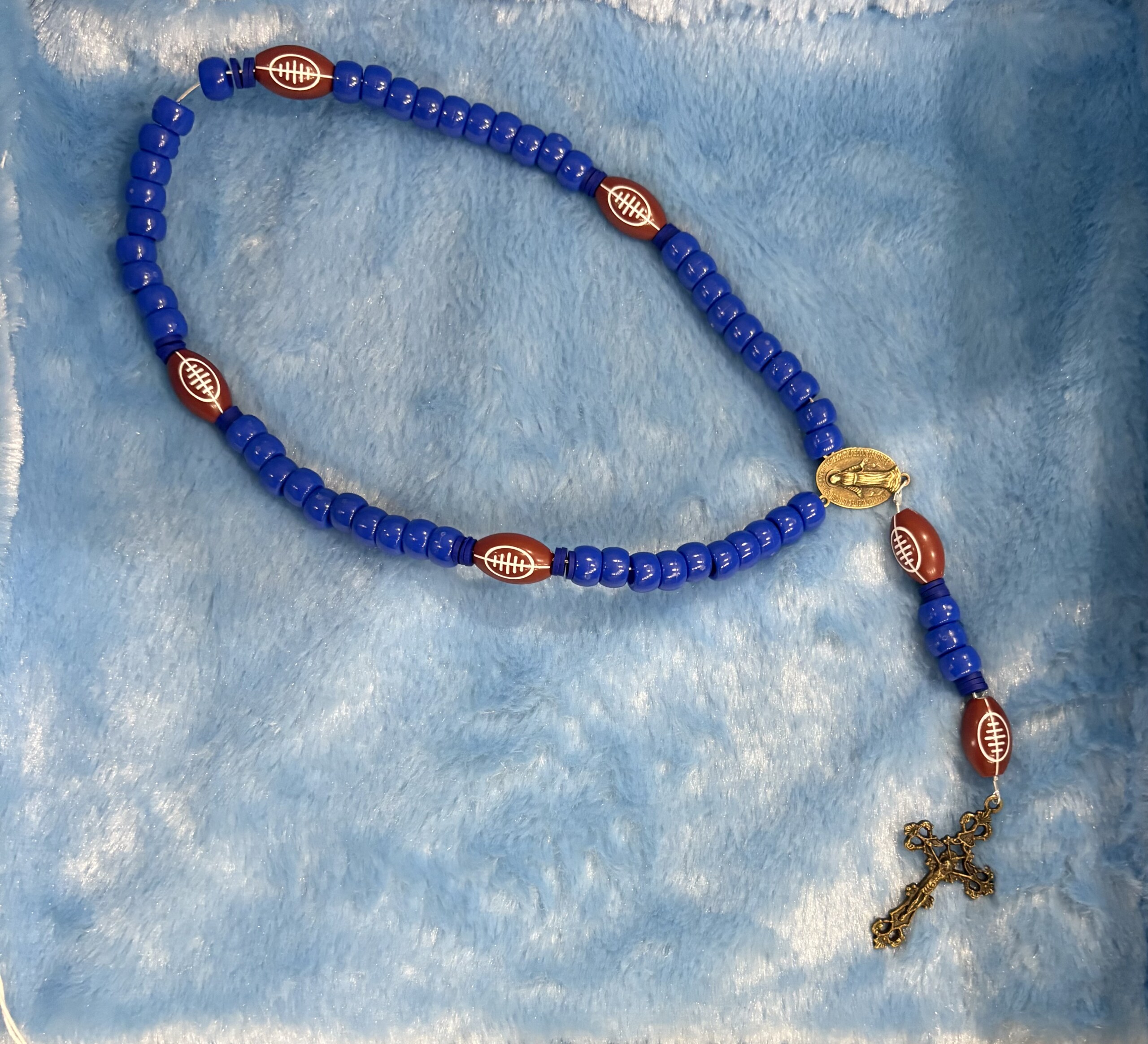 This handmade wire strung, miraculous medal rosary was inspired by my kids and husband. Their love and passion of Detroit Lions football is unmatched. My hope was that this rosary would grow their love of Mary and prayer! Message me your favorite sports team and I will do my best to make one, I also have baseballs and basketballs!