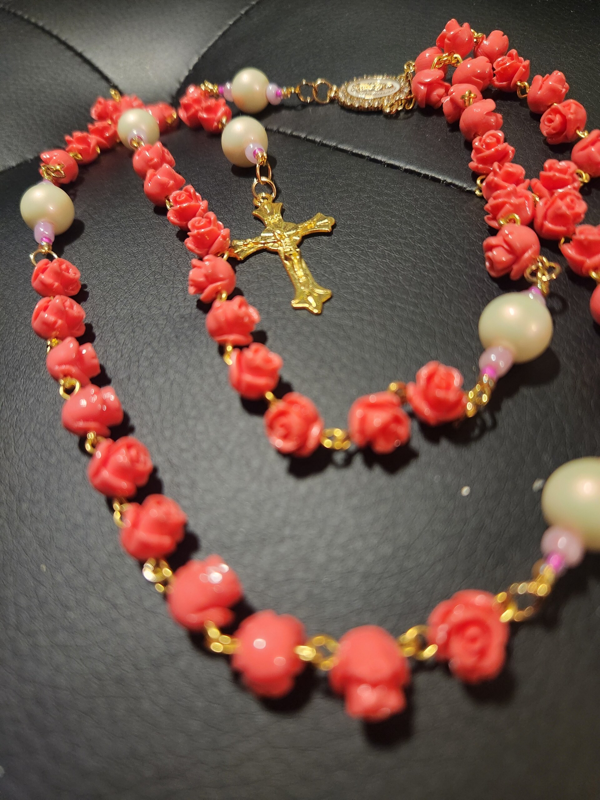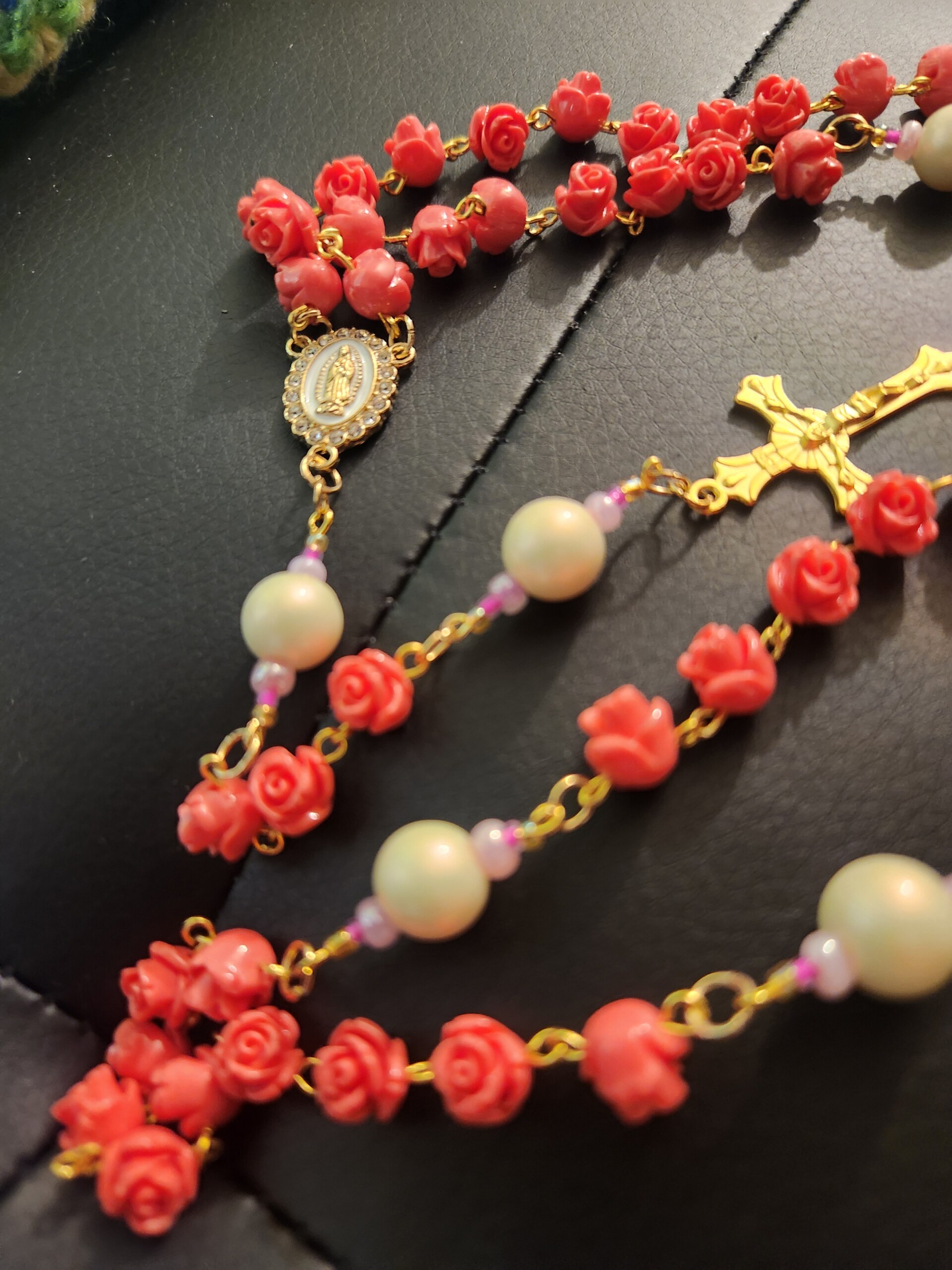 Full size hand crafted rosary. With pink rose shaped plastic beads, gold plated accents, Our Lady of Guadalupe centerpiece