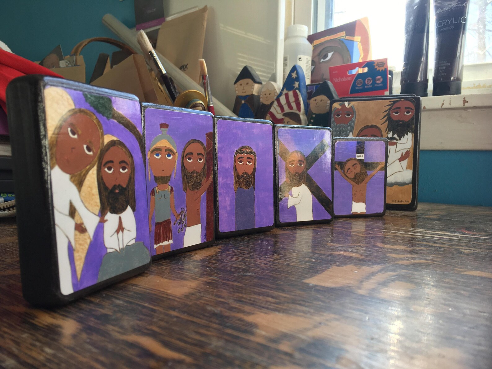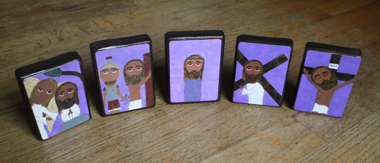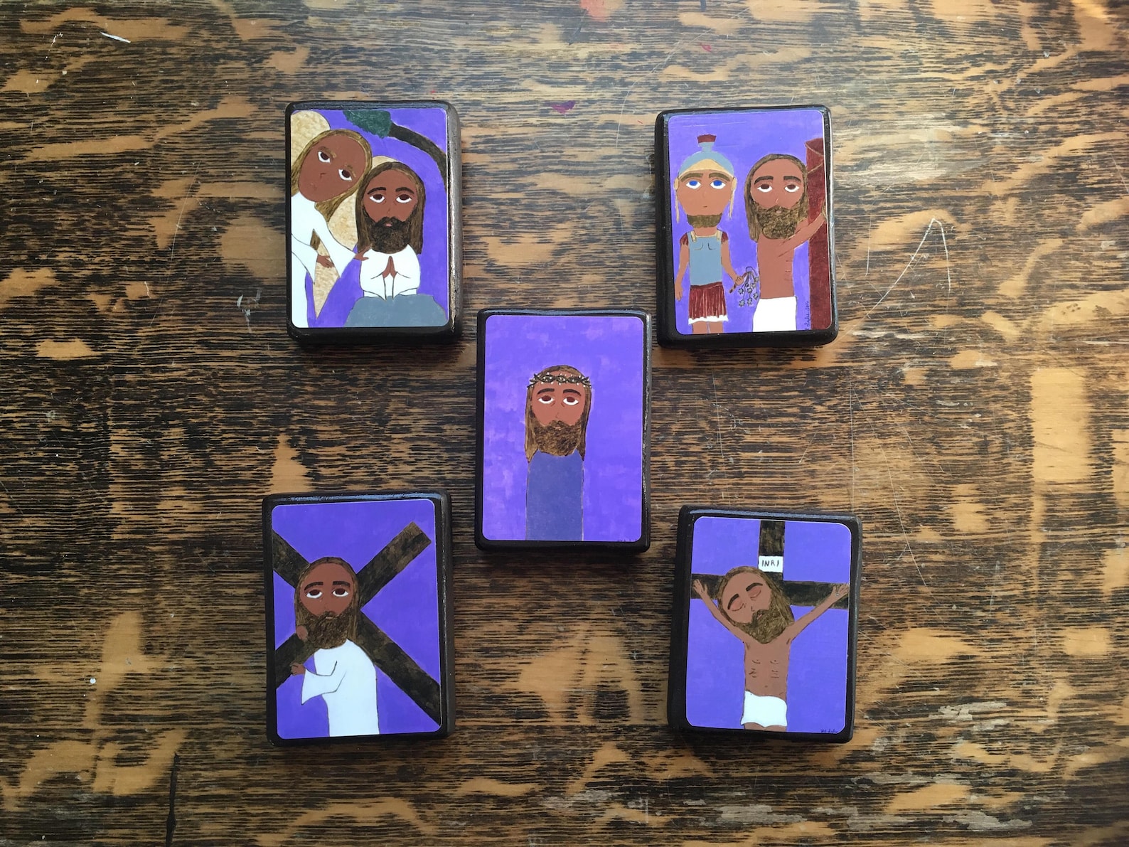 Full set of 5 Sorrowful Mysteries of the Rosary in Byzantine/ Folk Style on 2.5″ X3.5″ wood