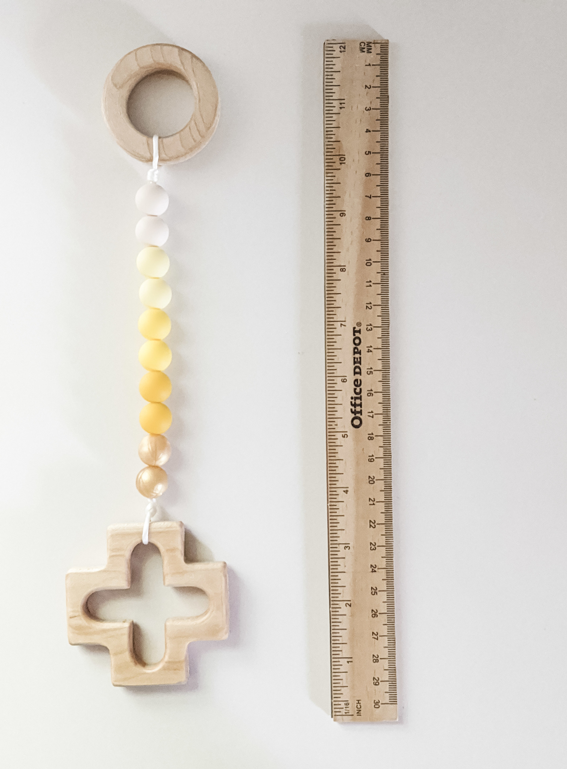 The wooden cross and ring are made out of durable maple wood, sanded smooth, and finished with baby safe and food grade mineral oil/beeswax blend