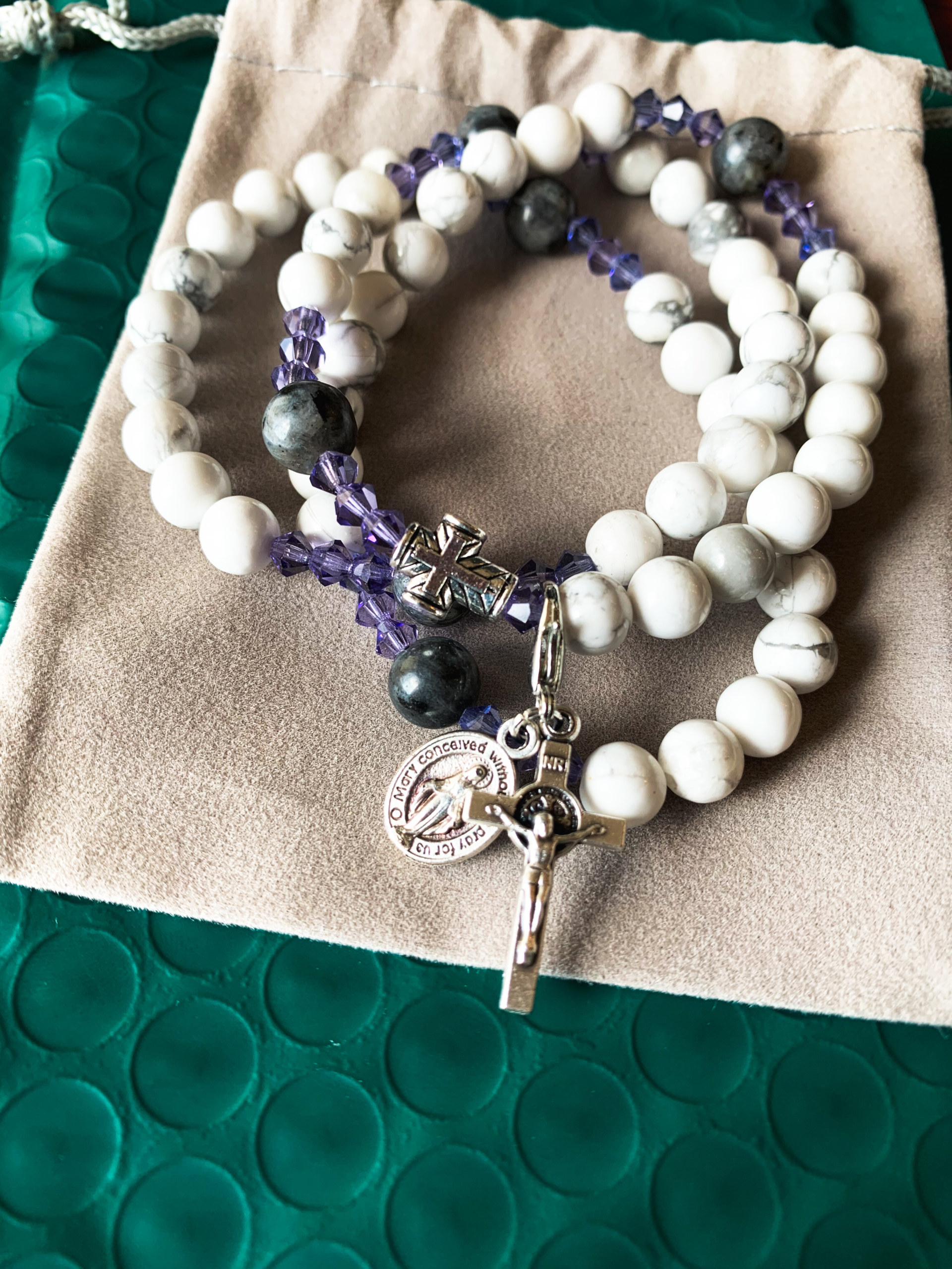 Made with howlite and grey prayer beads and your choice of accent crystals. The Godmother bracelet comes with a removable/movable Mary charm and mini crucifix. The Godfather decade features a St. Joseph medal and clasp to close the loop at the recipients discretion.