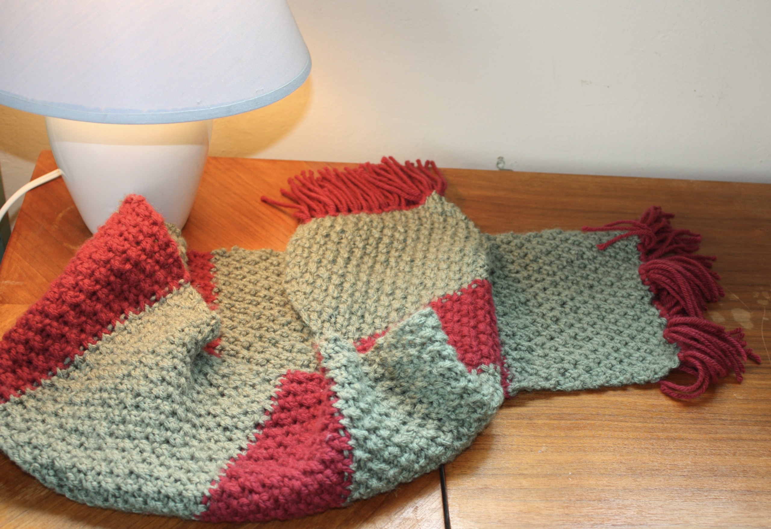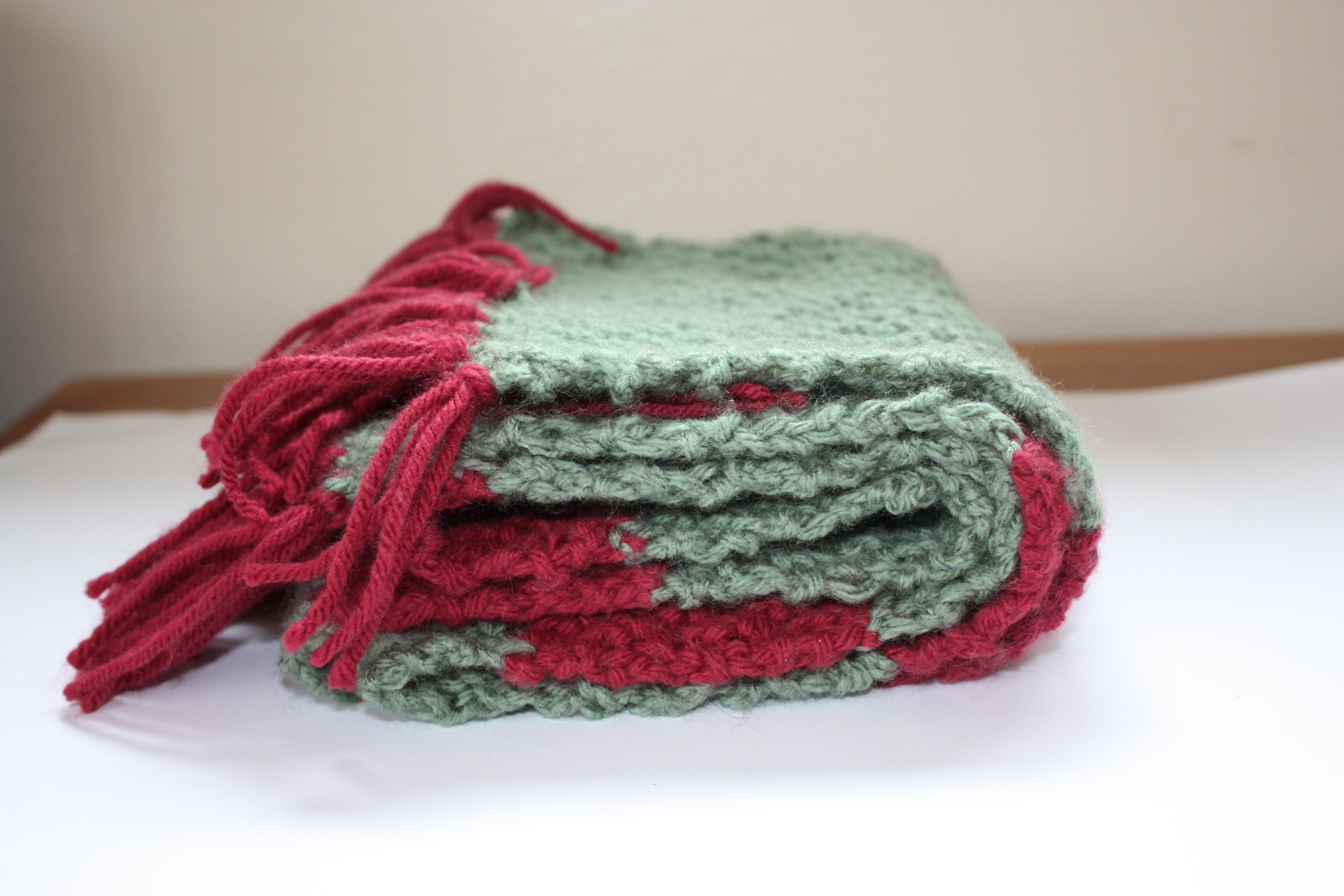 This scarf is hand knit in a stitch called Irish Moss, which gives it very straight edges. It is worked in two colors – longer strips of Sage Green, followed by smaller strips of Mulberry – and it has a Mulberry fringe at both ends. It is 100% acrylic and 55″ long (inclusive of fringe!) and 7″ wide.