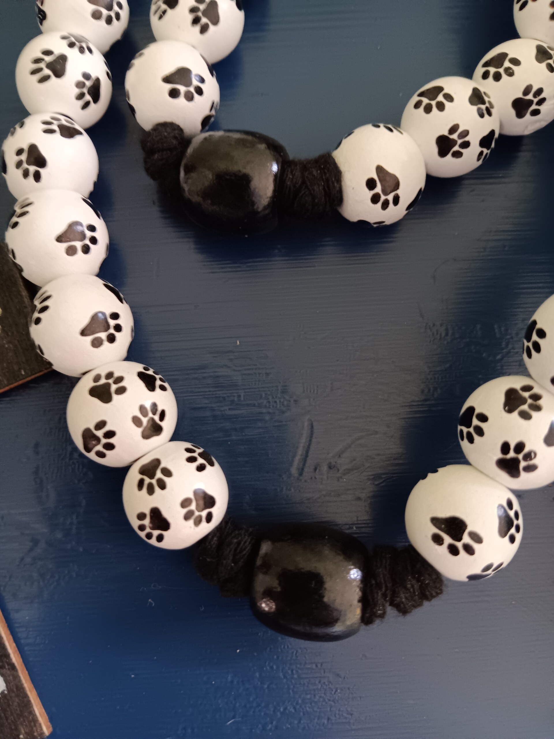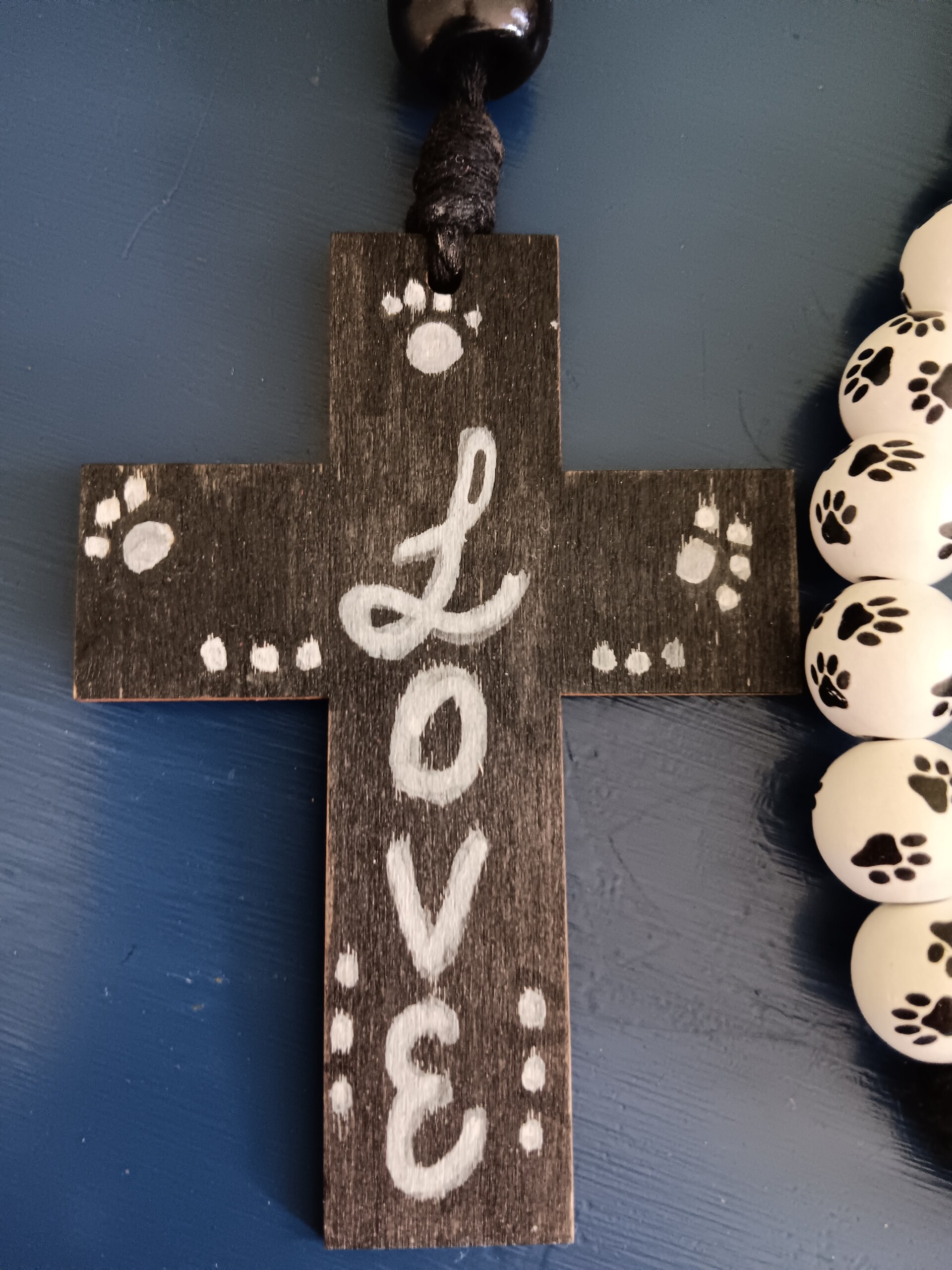 (0001)This rosary is white wooded beads with black paw prints. The string is 3mm soft material. The centerpiece was made from reclaimed wood and the cross is hand painted.