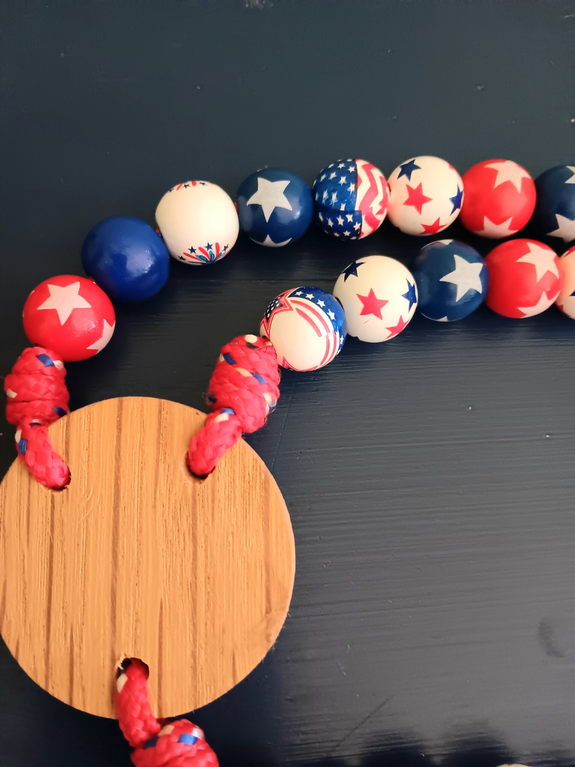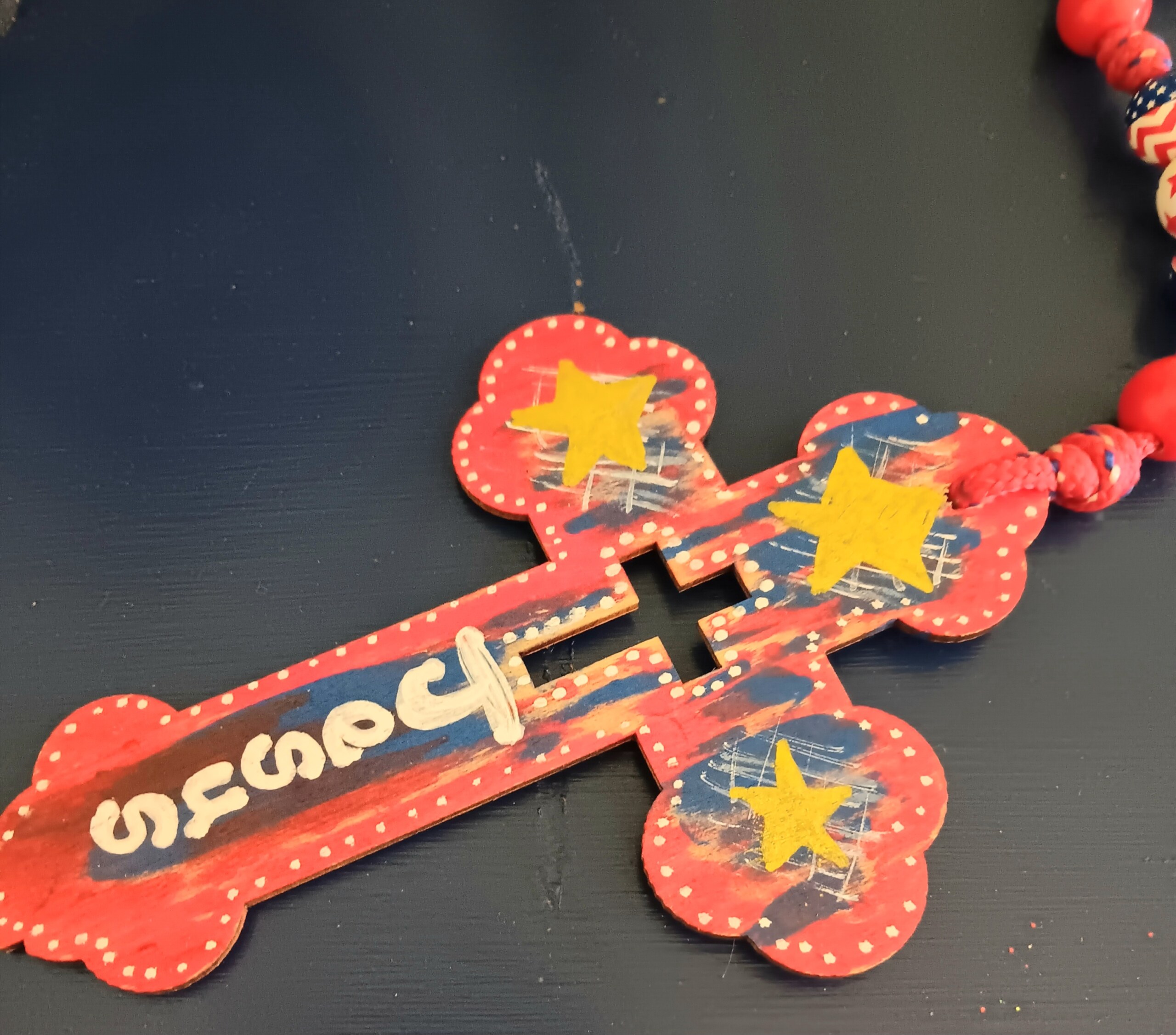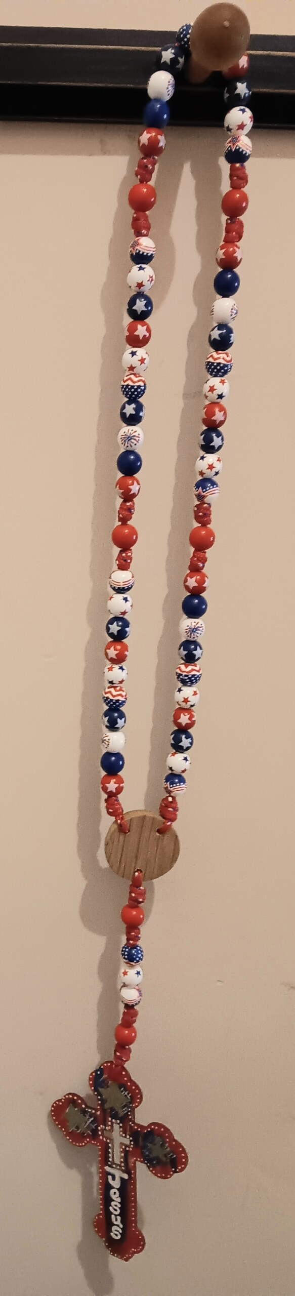 (0002)This rosary is patriotic with stars and stripes (red, white, and blue). All the beads are wooden 16mm. The string is red/white/blue 550 cord. The centerpiece was made from reclaimed wood and the cross is hand painted.