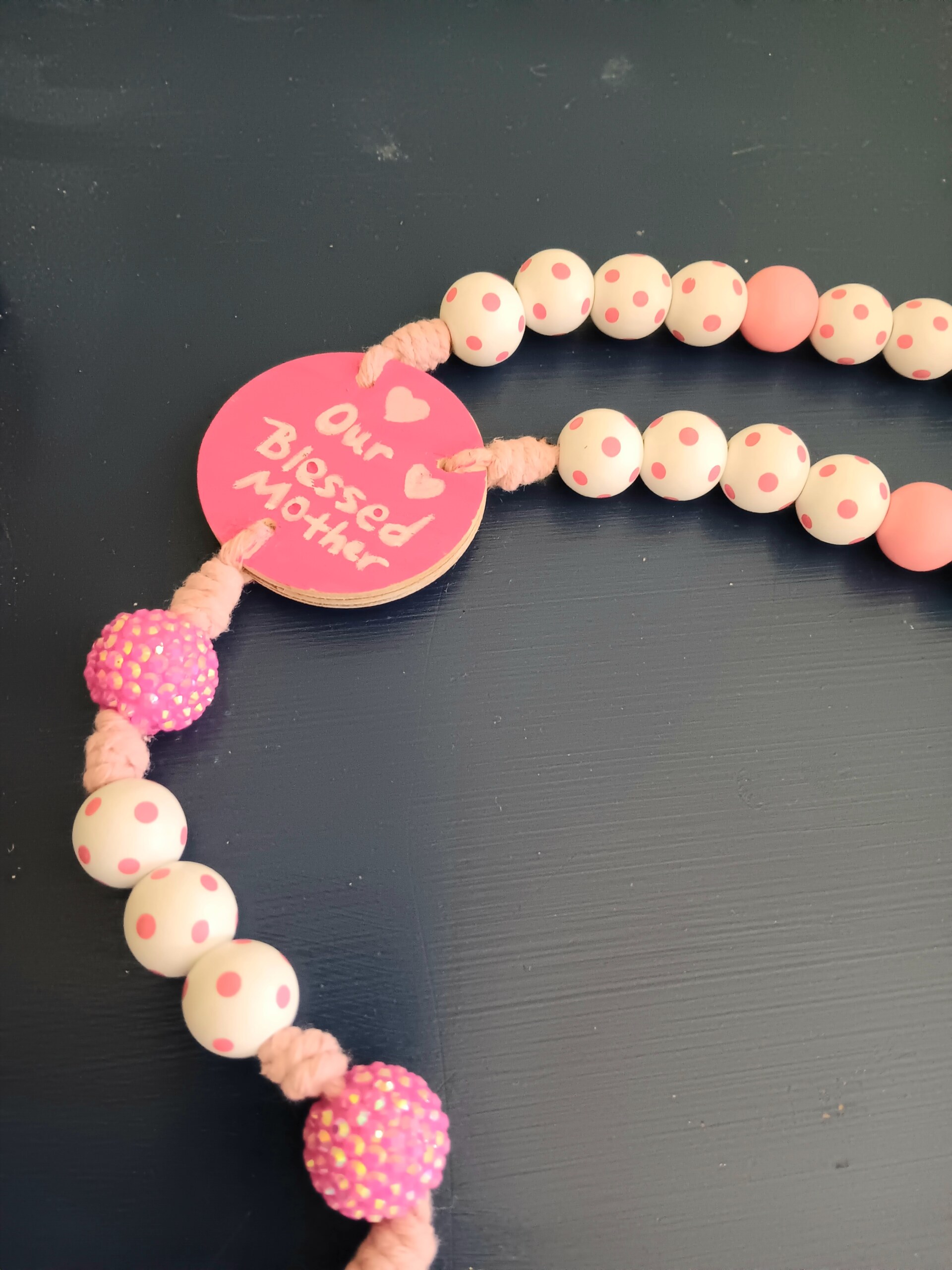 (0003)This Rosary is one of my favorites. It’s whe wooden beads (16mm) with pink dots. It also has 20mm acrylic bubblegum beads. The twine I used is a pink soft 3mm macrame. The centerpiece is hand-painted as well as the cross.