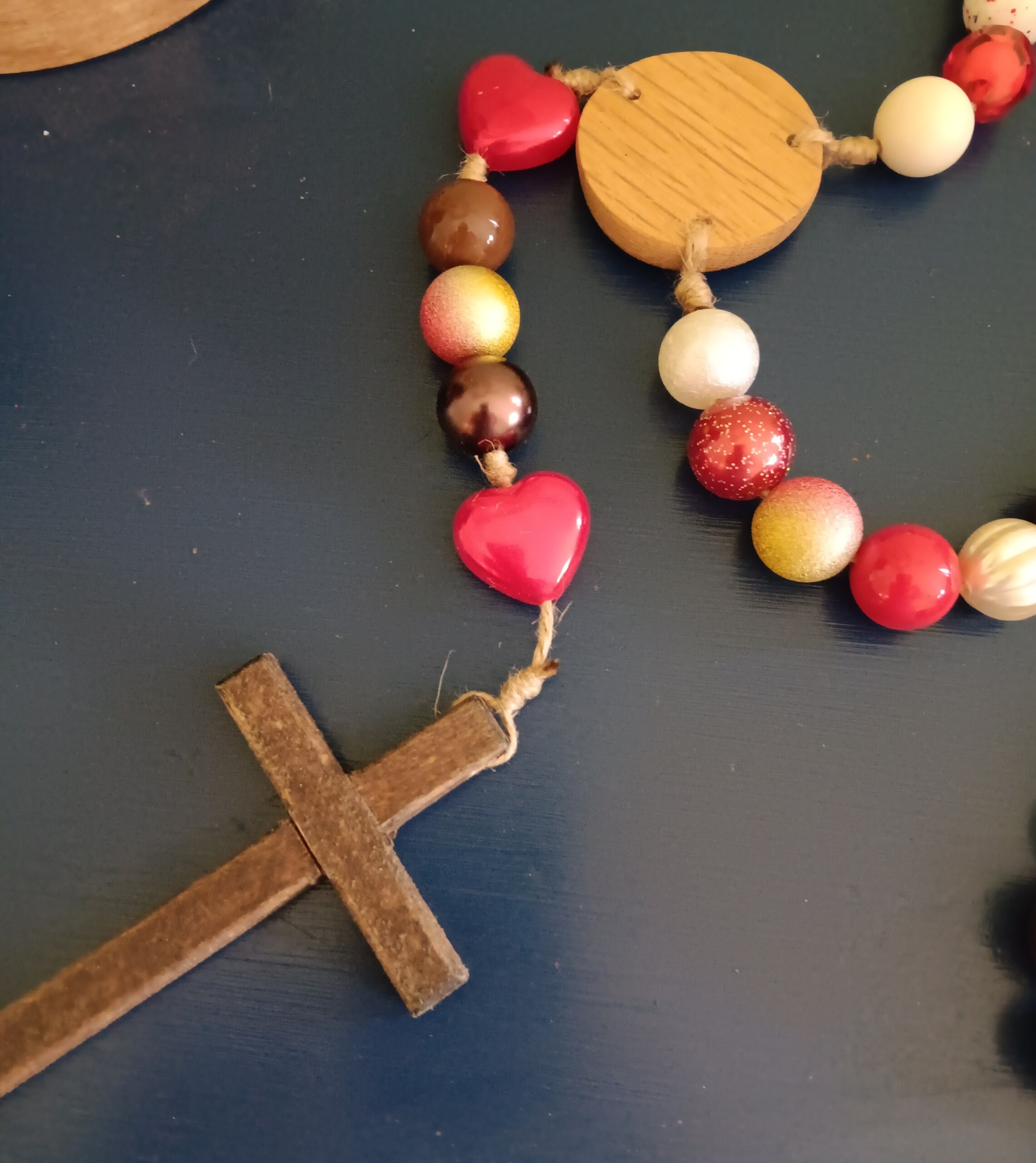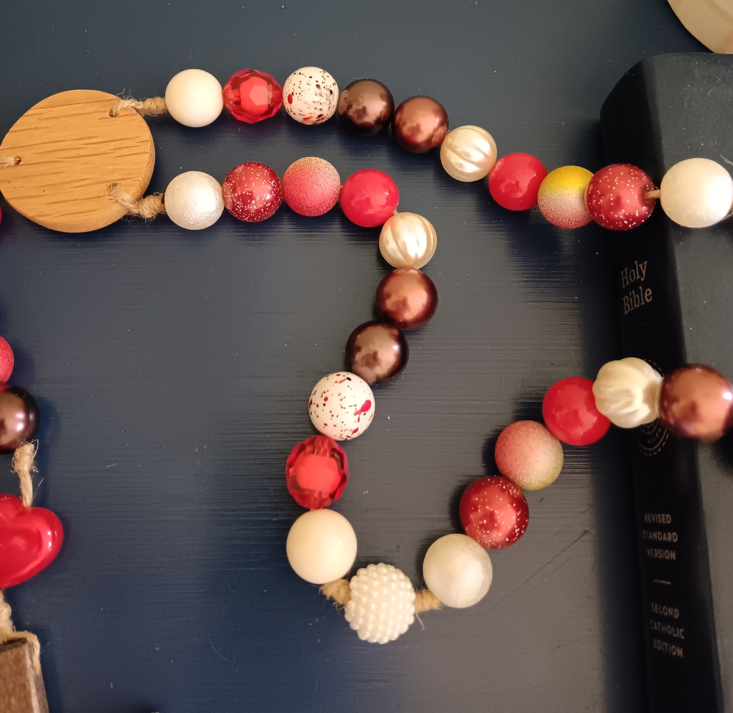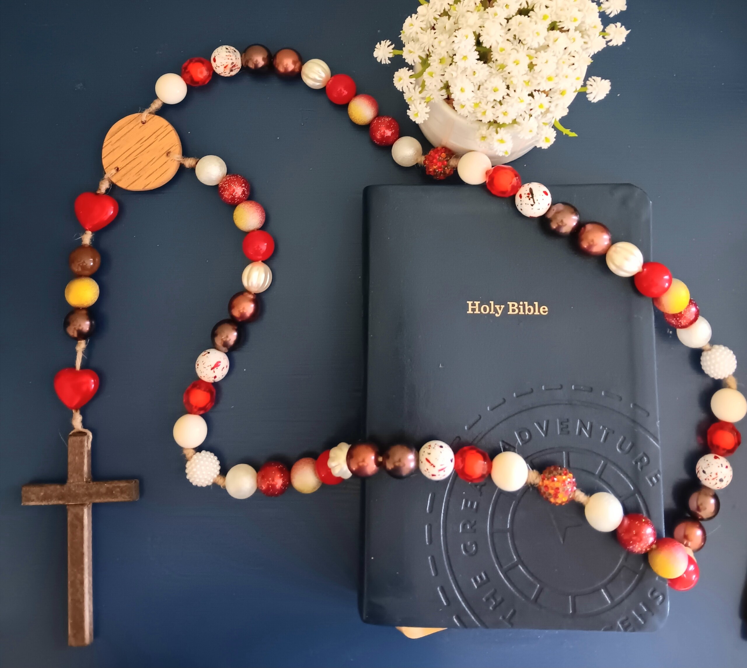 (0004)This rosary is so colorful with fall colors such as reds, oranges, brown, coffee, white acrylic beads. There are also sparkly and glitter beads. The string is regular twineThe centerpiece was made from reclaimed wood.